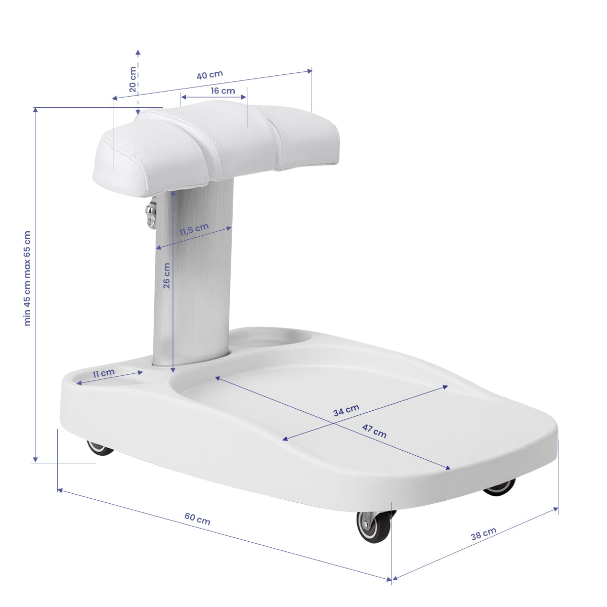 Pakojis susideda iš trijų dalių, iš kurių vidurinė yra ištraukiama. Rankinis aukščio reguliavimas leidžia jį pakelti iki 20 cm. Visos pakojo dalys yra aptrauktos sintetiniu oda, kuri užtikrina atsparumą drėgmei ir lengvą valymą. Dėl to vežimėlis gali būti pritaikytas individualiems vartotojo poreikiams, todėl tai puikus sprendimas tiek kosmetikos, tiek podiatrijos procedūroms, užtikrinant komfortą ir darbo tikslumą įvairiose pozicijose.