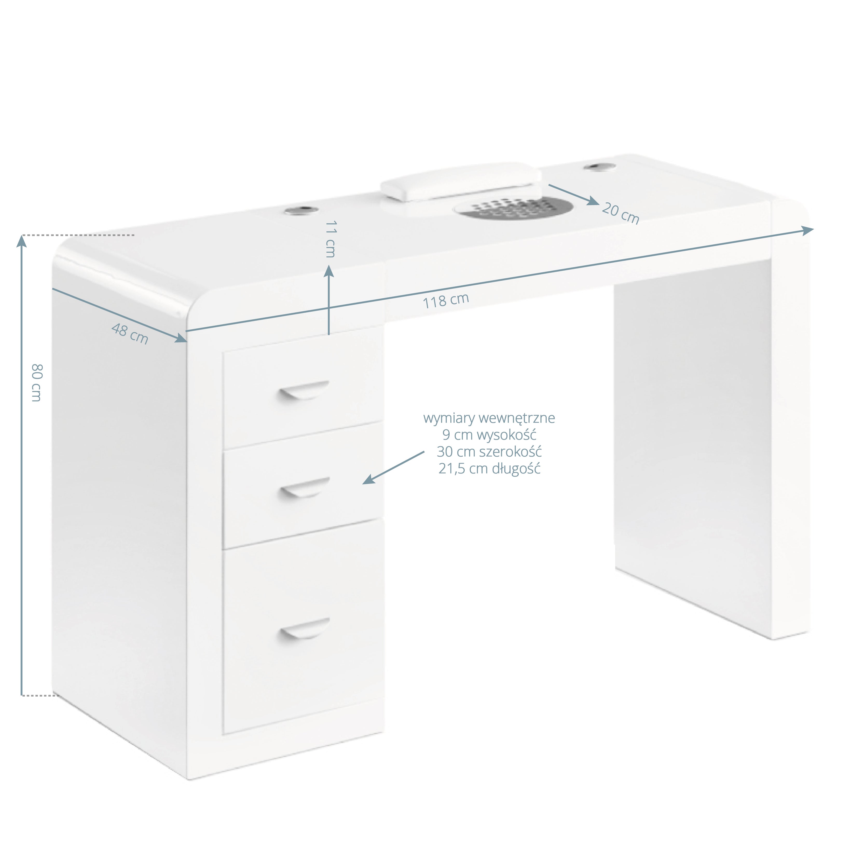 Trys erdvūs stalčiai palengvina organizavimą ir būtinos kosmetikos bei įrankių tvarką. Stalas yra aprūpintasdulkių surinkimo įrenginiu, kuris efektyviai sumažina kenksmingų dulkių kiekį, užtikrindamas švarų ir gaivų orą darbo vietoje. Tuo pačiu metu, dėka integracijos į stalviršį, neužima vertingos darbo vietos. Specialiai sukurta vieta laidams palengvina būtinos įrangos organizavimą salone, pavyzdžiui, nagų frezoms, apšvietimo lempoms ar UV lempoms, leidžiant paslėpti laidus.