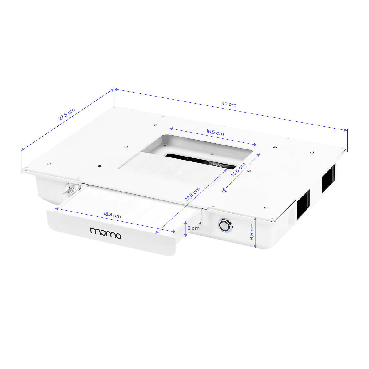 Momo J-02 kasetinis dulkių surinkėjas, įmontuotas į stalviršį, žymiai pagerina darbo komfortą ir higieną, efektyviai pašalindamas dulkes, susidarančias grožio procedūrų metu, pavyzdžiui, manikiūro metu. Dėl šio įrenginio salonas išlieka švarus, o darbo vieta – be taršos, kas didina tiek meistro, tiek klientų saugumą. Dulkių surinkėjas yra lengvai naudojamas ir prižiūrimas, kas dar labiau pagerina jo funkcionalumą. Reguliarus valymas ir filtro keitimas užtikrina nuolat aukštą absorbcijos efektyvumą. Galima įsigyti papildomų pakaitinių filtrų (SKU 123581).