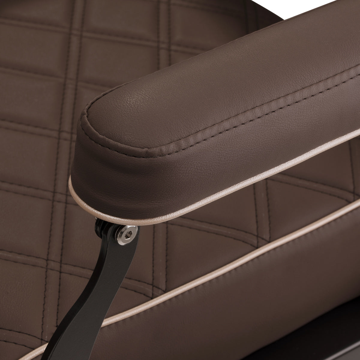 Tvirta konstrukcija užtikrina stabilumą ir aukštą naudojimo komfortą. Sėdynė užpildyta deformacijai atsparia putomis, o minkšta, matinė sintetinė oda suteikia baldams patvarumo ir komforto. Drėgmei atsparios medžiagos ne tik patvarios, bet ir lengvai valomos. Rudos spalvos apmušalai suteikia kėdei unikalų charakterį, o jos elegantiškas stilius puikiai dera bet kokiame kirpyklos interjere.