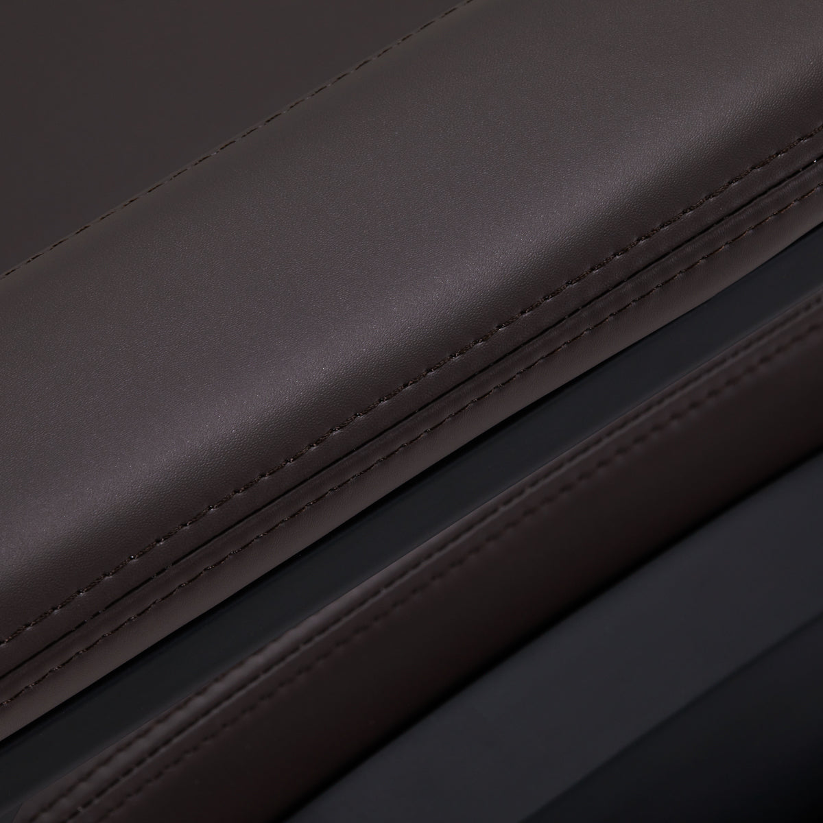 Tvirta bazės konstrukcija užtikrina baldų stabilumą ir ilgaamžiškumą. Maloni liesti sintetinės odos apmušalai rudos spalvos atspalviais yra estetiški, atsparūs drėgmei ir lengvai valomi. Visi šie elementai sukuria baldą, kuris ne tik puikiai atlieka savo funkciją, bet ir suteikia salonui elegancijos ir profesionalumo.