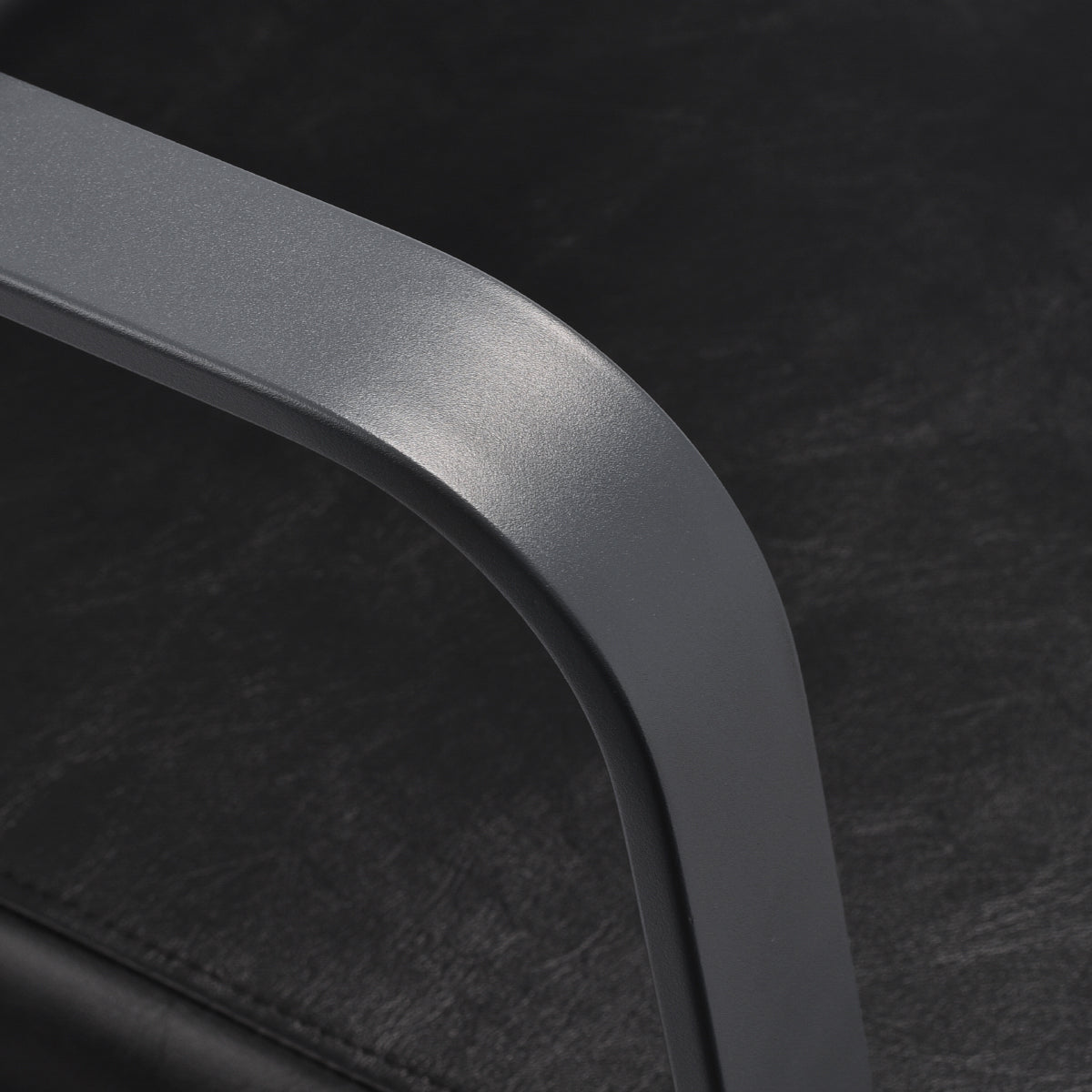 Užpildas iš tvirtų, deformacijai atsparių putų ir apmušalai iš malonios liesti sintetinio odos užtikrina baldų ilgaamžiškumą ir patogų naudojimą ilgą laiką. Tai taip pat daro įrangą atsparią drėgmei, tvirtą ir lengvai valomą. Juoda apdaila suteikia unikalų charakterį. Įranga išsiskiria moderniu dizainu, todėl fotelis puikiai atrodo daugelyje profesionalių salonų.
