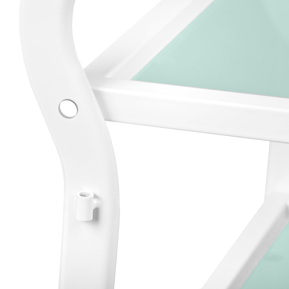 stalas kosmetikos prietaisui, pagamintas iš metalo ir stiklo, su ratukais. turi tris stiklines lentynas.