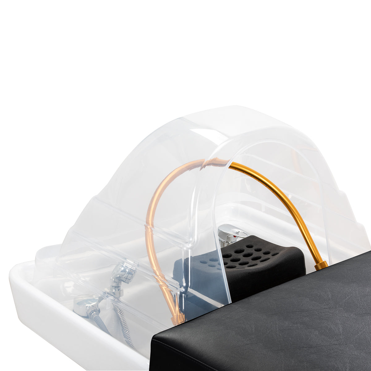 Plovimo įrenginys yra aprūpintas maišytuvu, leidžiančiu lengvai reguliuoti temperatūrą pagal kliento pageidavimus. Praktinė vieta dušo galvutei palengvina darbą, o kamštis su specialiu filtru leidžia kontroliuoti vandens srautą ir palaikyti aukštus higienos standartus salone. Vandens jungtis yra po dubeniu ir gale po dušo padėklu, estetiškai slepianti instaliaciją. Ergonomiškai suformuotas gultas užtikrina komfortą ir tinkamą atramą procedūrų metu, o komplekte esantis pufas didina personalo patogumą. Funkcionalumo ir patogumo derinys daro šią plovimo stotį universalia įranga tiek kirpykloms, tiek SPA salonams.