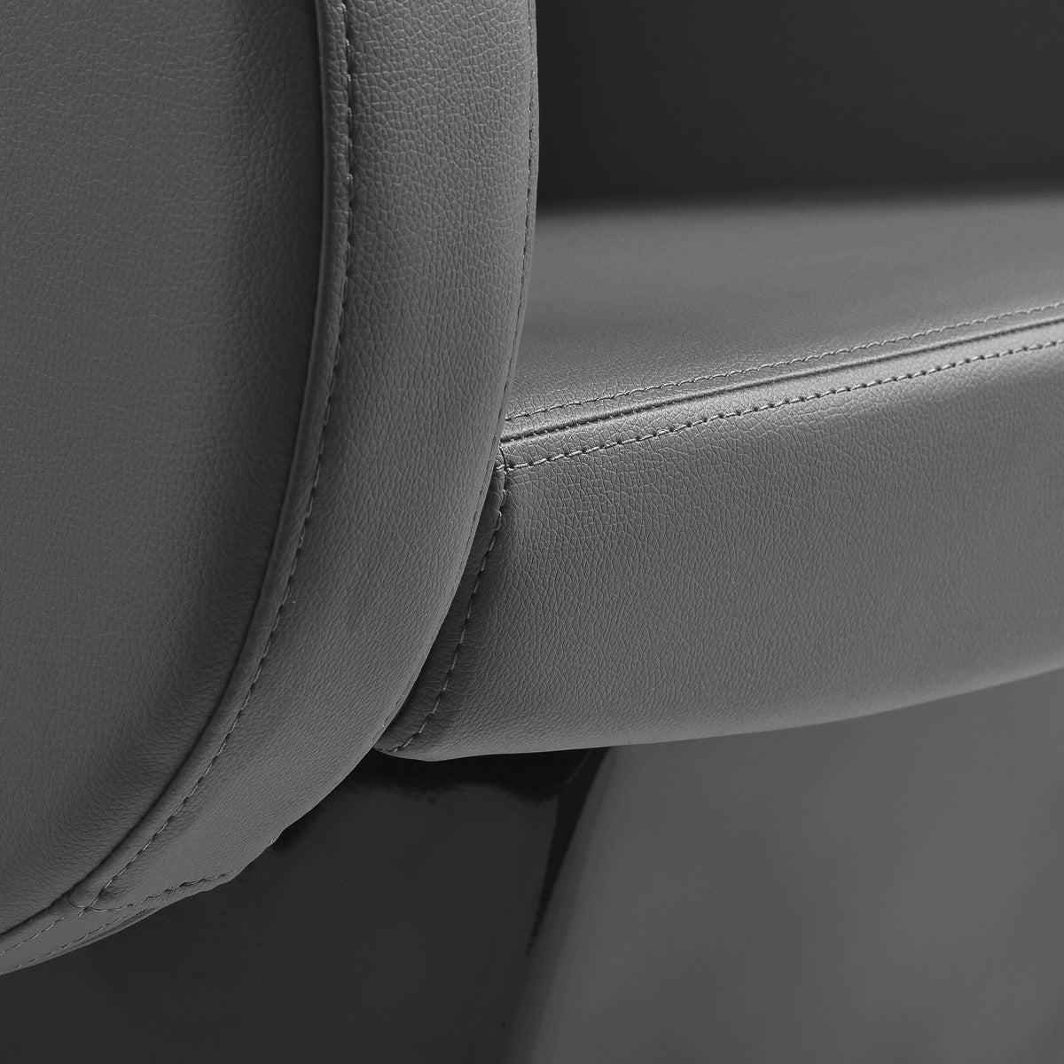 Kėdė, užpildyta patvaria putomis, užtikrina aukštą komfortą, o įspūdingai profiliuoti porankiai leidžia patogiai laikyti pečius. Atlošas, optimalia kampu, palaiko stuburą, užtikrindamas visišką atsipalaidavimą. Sintetinio odos apmušalas pilkos spalvos atspalviais užtikrina patvarumą ir lengvą valymą. Moderni baldų forma pabrėžia interjero elegantišką charakterį. Komplekte yra pilnas matinių juodos spalvos fitingų rinkinys, įskaitant maišytuvą, dušo galvutę ir atitinkančias žarnas, teikiantis pilną darbo įrankių rinkinį.
