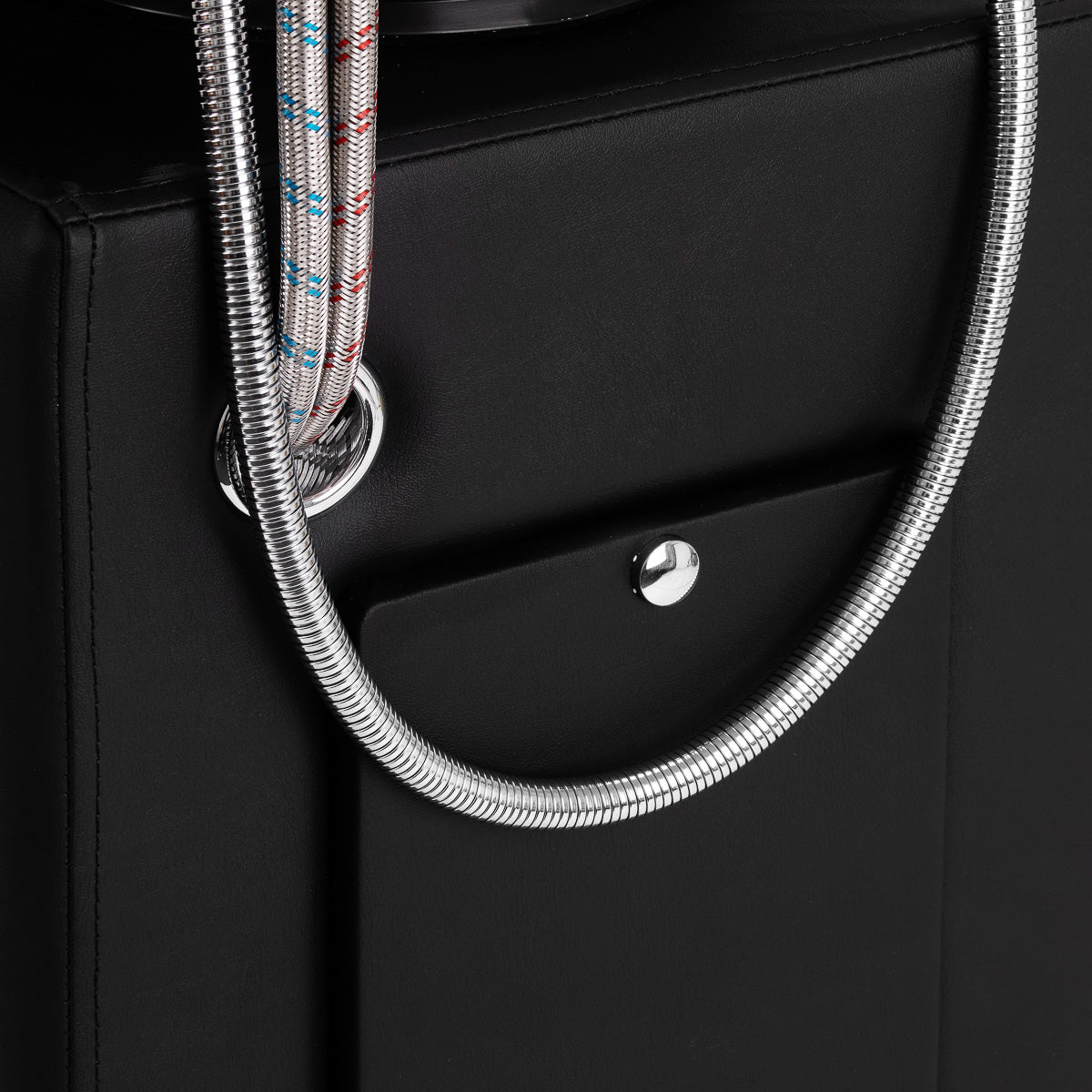 Ergonomiškai profiliuota kėdė su tvirtu putų užpildymu užtikrina aukštą naudojimo komfortą. Švelniai išlenkti, dalinai apmušti porankiai leidžia taisyklingai laikyti pečius ir yra patrauklus vizualinis elementas. Patogus atlošas garantuoja stabilų nugaros palaikymą ir taisyklingą laikyseną procedūros metu. Juoda apmušalo spalva kartu su dekoratyviniais metaliniais elementais suteikia visumai laikui nepavaldų, elegantišką charakterį. Naudotos medžiagos išsiskiria patvarumu ir lengvu valymu. Originali plovimo stoties forma suteikia interjerui unikalumo. Komplekte yra visi reikalingi priedai, įskaitant maišytuvą, dušo galvutę ir specialius žarnų komplektus, užtikrinančius pilną paruošimą naudojimui.