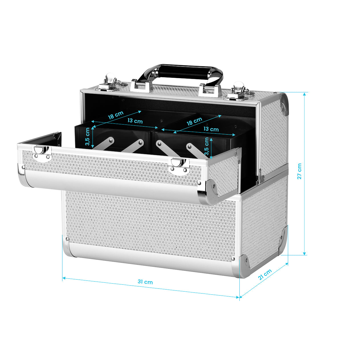 Modernus dizainas sidabro atspalviais su blizgučių akcentais suteikia elegantišką prisilietimą. Rankena palengvina transportavimą, kas ypač svarbu mobiliems stilistams. Pagaminta iš patvarių, atsparių pažeidimams medžiagų, užtikrina kasdienio naudojimo komfortą. Tvirtas užsegimas su raktu apsaugo turinį, o lengva, patvari konstrukcija leidžia lengvai nešioti kosmetinę.