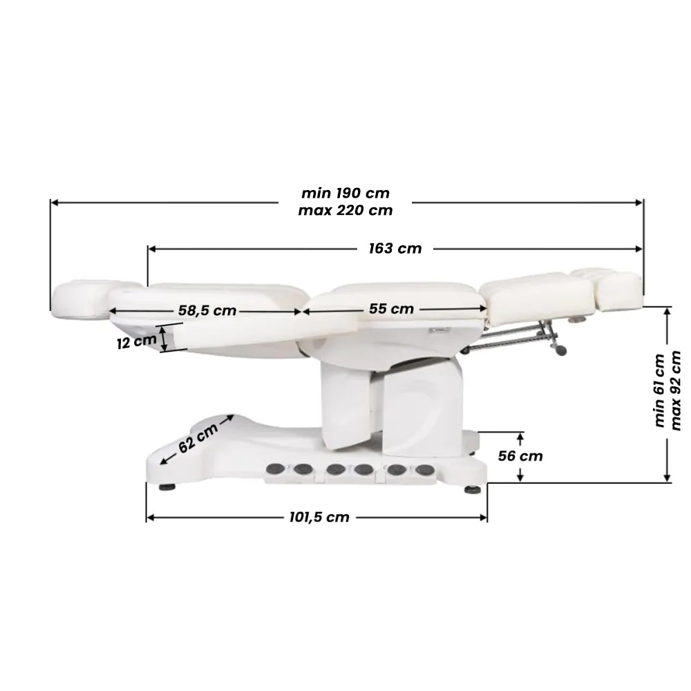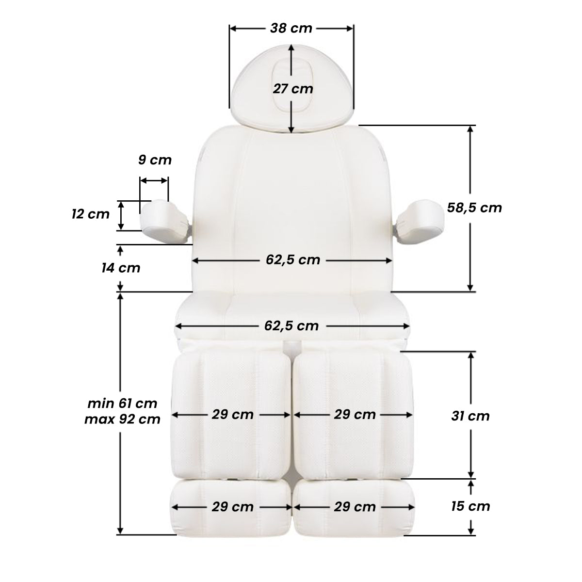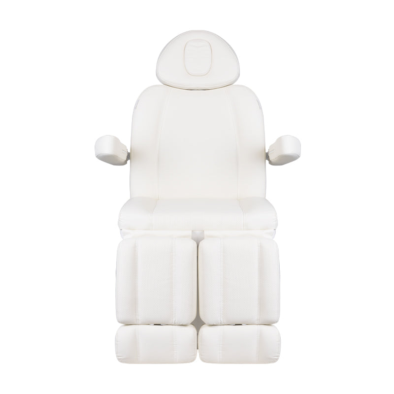 Unikali elektrinė kosmetinė kėdė, idealiai tinkanti grožio salonams ir SPA salonams. Dėl nepriklausomų pavarų ji leidžia reguliuoti kėdę 3 plokštumose nuotolinio valdymo pultu ir kojiniais jungikliais, suteikiant galimybę patogiai atlikti pedikiūro procedūras, taip pat veido ir kūno procedūras. Naudojant nuotolinio valdymo pultą, galime naudoti programuojamus nustatymus ir įjungti KARŠTO funkciją, t.y. šildymą. Kėdėje naudojama perforuota apmušalai, ko nėra kitose kėdėse, ir spalvota LED apšvietimas pagrinde.