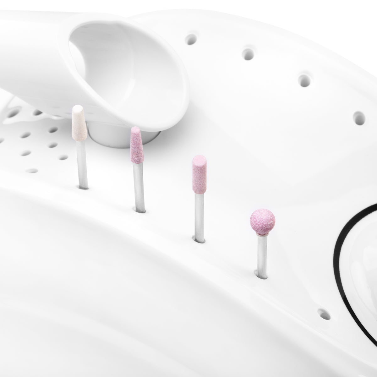 Dėžutėje yra frezų rinkinys (nemokamai). Tai reiškia, kad galite iš karto pradėti dirbti su šia nagų gręžimo mašina. Galite dirbti namuose arba savo grožio salone.