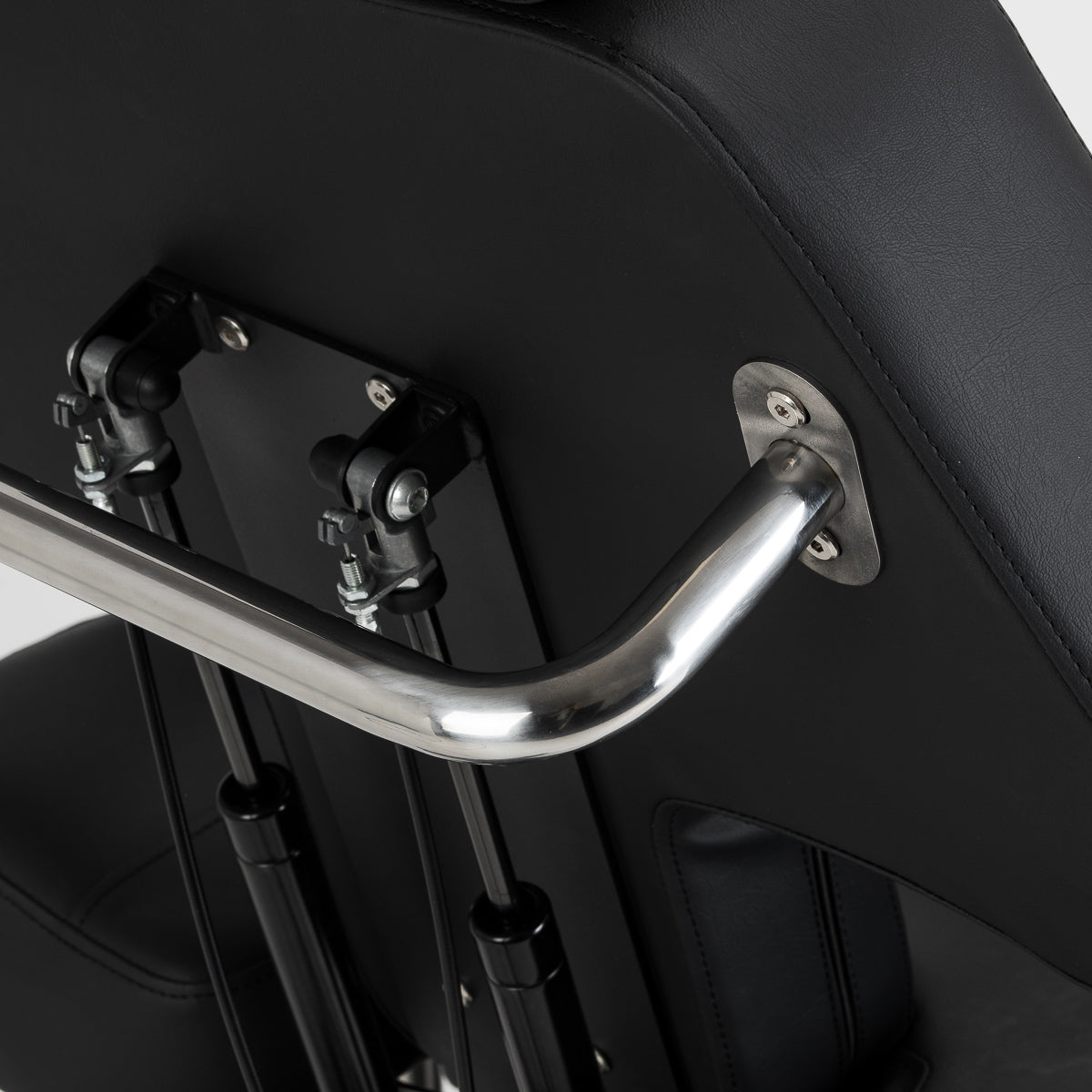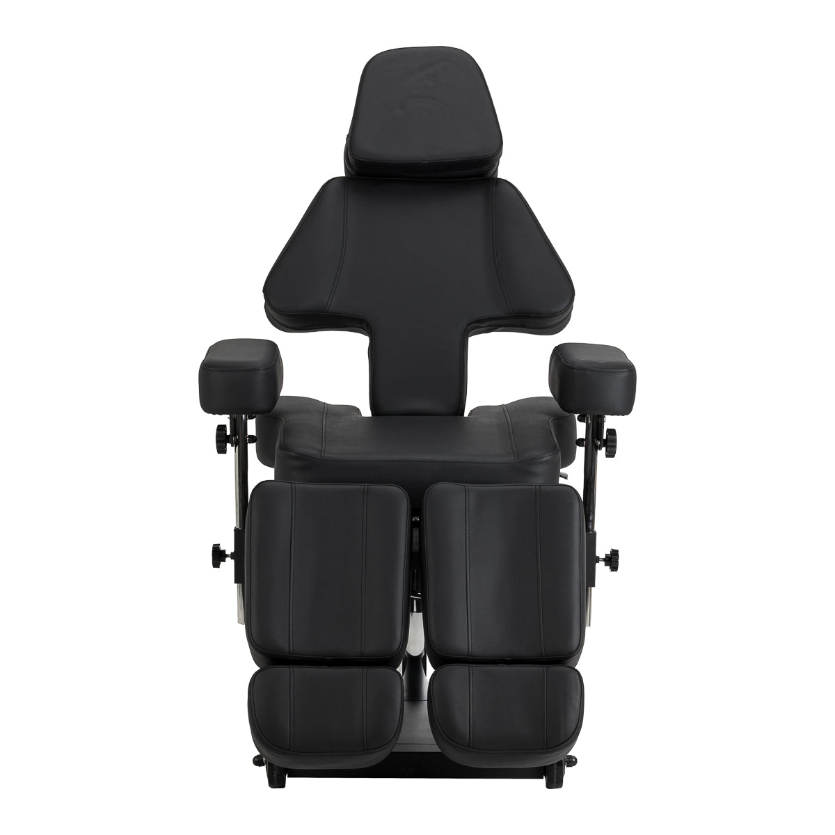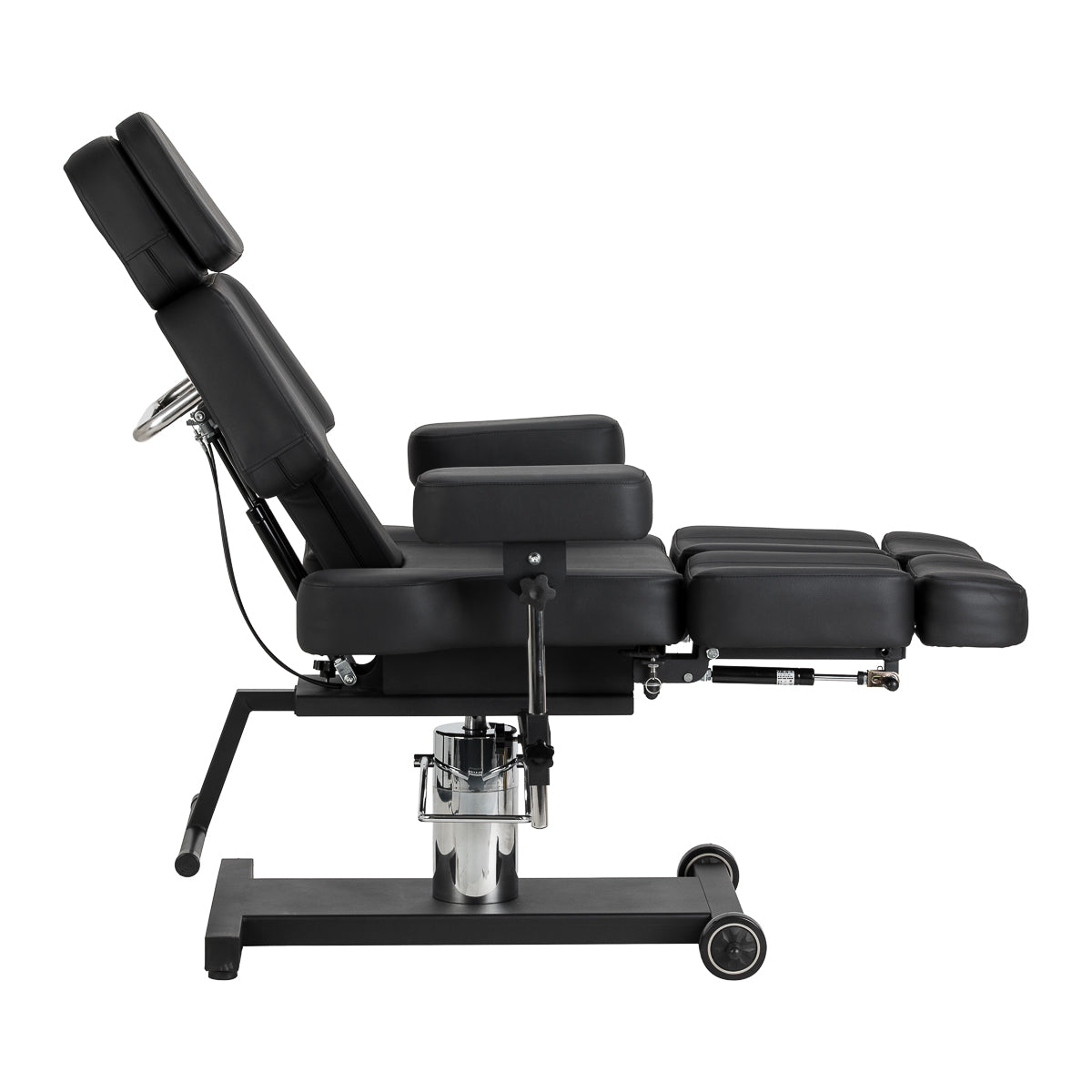Sėdynės aukštis reguliuojamas hidrauliniu pakėlėju diapazone nuo 60 iki 78 cm, o pilnai išskleista kėdė pasiekia iki 200 centimetrų ilgį. Rankinis atlošo ir kojų atramos kampų reguliavimas leidžia pritaikyti padėtį pagal atliekamą procedūrą. Padalinta kojų atrama su nepriklausomu segmentų reguliavimu ir šonine reguliacija leidžia individualiai nustatyti kojų padėtį, didinant judėjimo laisvę ir kliento patogumą. Ištraukiama kojų atramos dalis užtikrina tvirtą atramą net ir aukštesniems žmonėms. Nuimami porankiai su aukščio ir kampo reguliavimu padidina galimų nustatymų skaičių, palengvindami kėdės pritaikymą prie esamų poreikių. Visa tai sudaro ergonomišką ir funkcionalų sprendimą, puikiai pritaikytą profesionalios tatuiruočių studijos darbo sąlygoms.