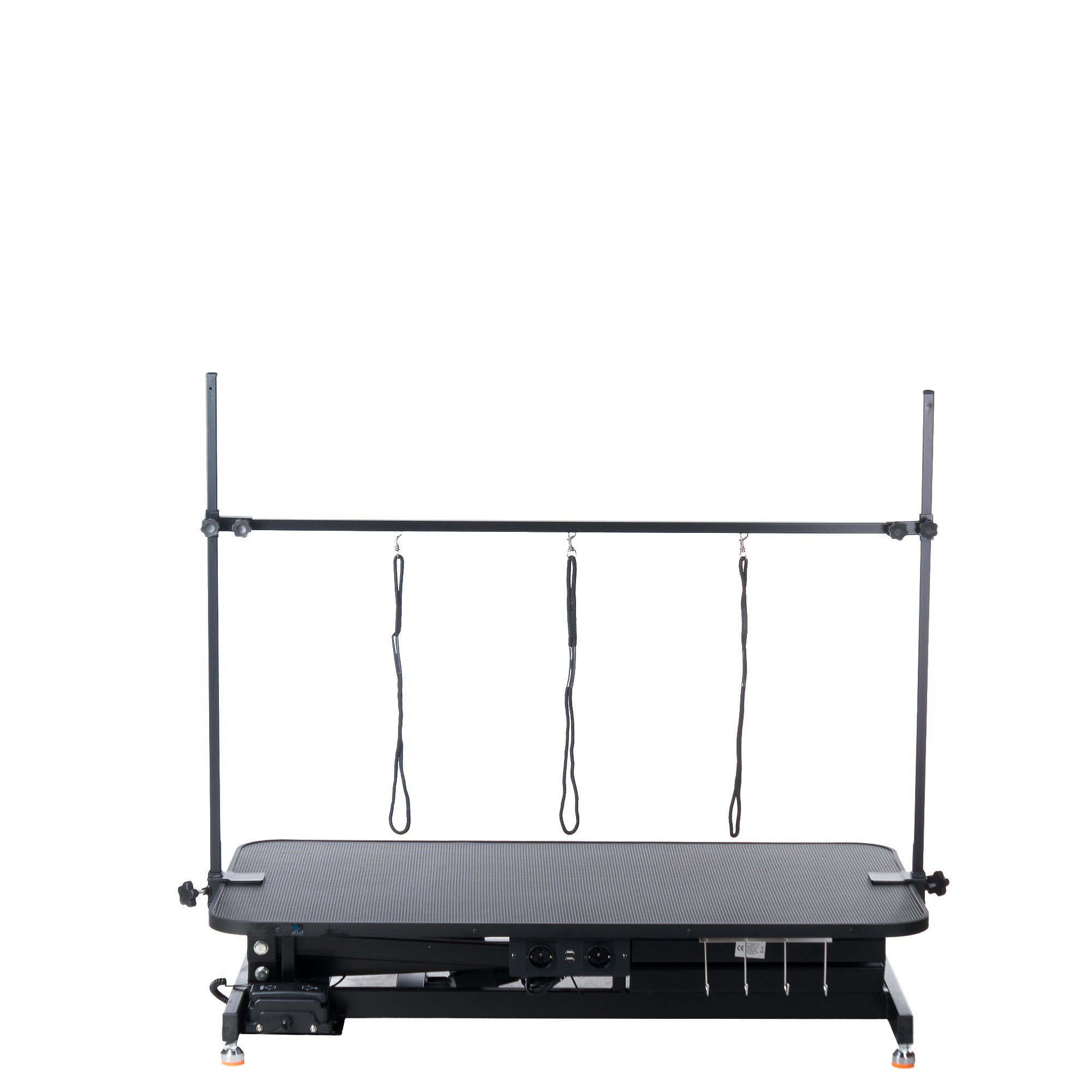 Gyvūnų priežiūros groomerio stalas XL dydžio. Ypač stabilus stalviršis, padengtas juodos spalvos neslystančia danga. Plieninė juoda rėmas, dažytas milteliniu būdu. Stalviršio aukštis reguliuojamas elektriškai, todėl stalą galima idealiai pritaikyti pagal savo poreikius ir augintinio dydį. Komplekte reguliuojama aukščio skersinė su trimis pavadėliais.