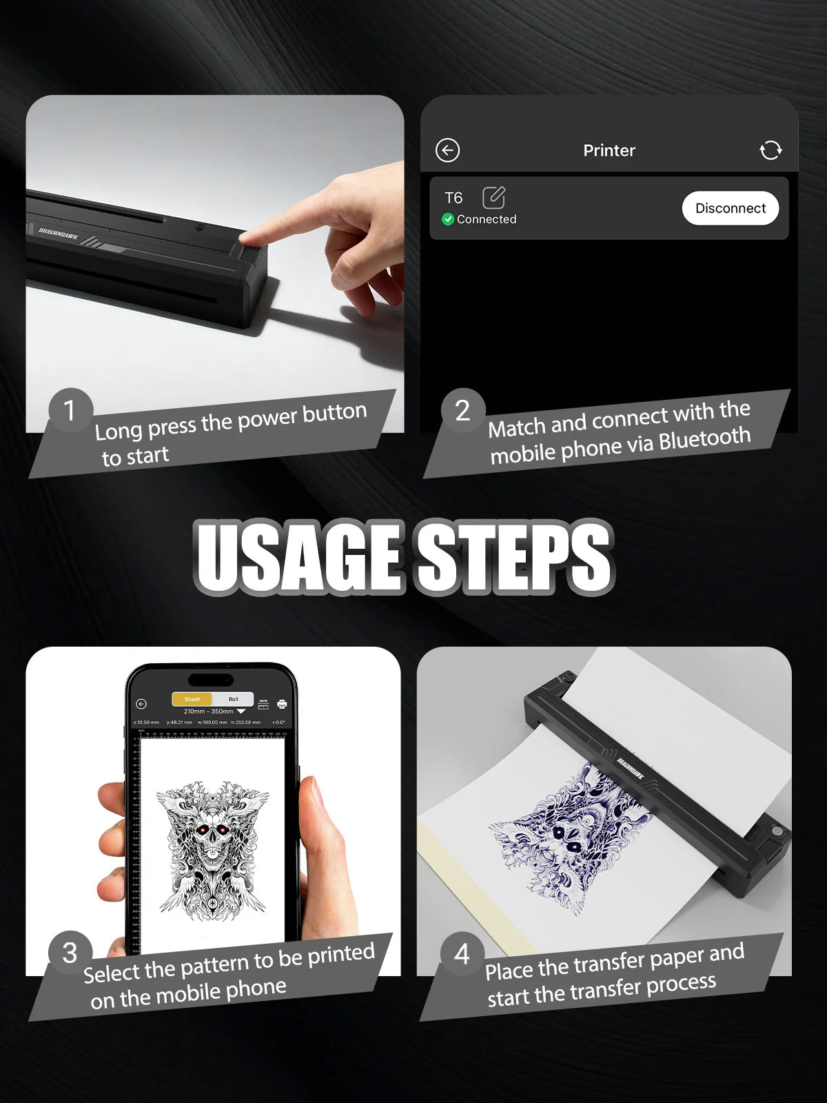 DragonHawk A4 belaidis terminis tatuiruočių trafaretų spausdintuvas yra kompaktiškas, aukštos kokybės nešiojamas trafaretų spausdintuvas, sukurtas profesionaliems tatuiruočių meistrams, kuriems reikalingi greiti, tikslūs ir patikimi trafaretų perkėlimai. Su Bluetooth ryšiu ir kelių įrenginių suderinamumu, šis įrenginys leidžia spausdinti tiesiogiai iš išmaniųjų telefonų, planšečių ar kompiuterių.