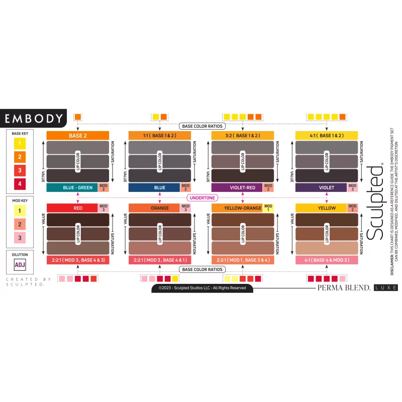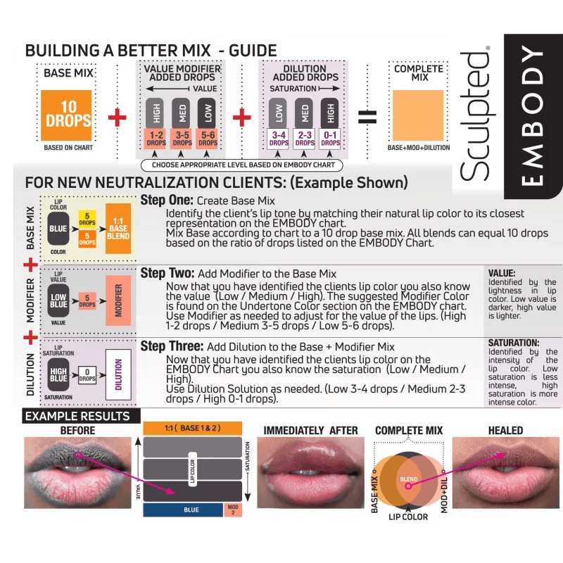Embody rinkinys, sukurtas garsiosios Sculpted Studio savininkės Carlos Ricciardone. Ši išskirtinė aštuonių permanentinių makiažo dažų kolekcija specialiai sukurta šaltų ir tamsių tonų lūpoms, leidžianti sklandžiai susilieti su natūralia audinių spalva ir pagerinti neutralizaciją.