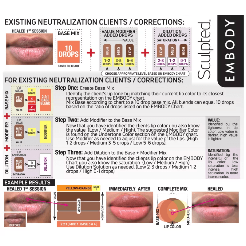 Šis universalus rinkinys tinka visų tipų lūpų neutralizavimui – nuo giliausių, tamsiausių šaltų atspalvių iki šiltesnių, rudų potonių. Su trimis korektoriais galite lengvai reguliuoti pigmentus, kad pasiektumėte norimą efektą. Naudokite Embody rinkinį pradiniam neutralizavimui ir derinkite jį su Carla Enhance pigmentais būsimoms procedūroms, kad sukurtumėte nuostabų lūpų dažų efektą.