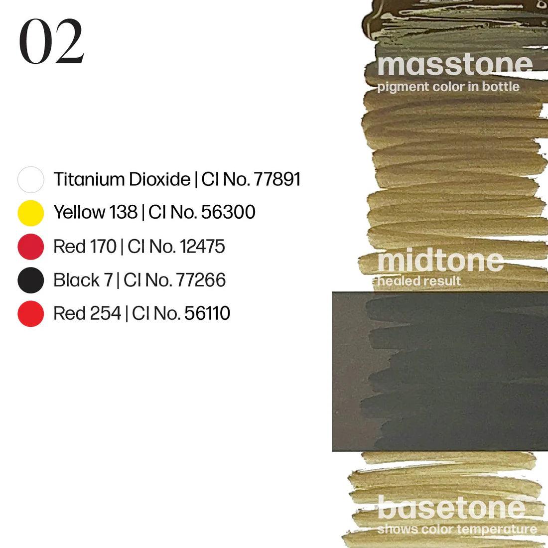 - 02: Tamsesnis, neutralus atspalvis idealiai tinka klientams, kurių šviesūs plaukai yra šiltesnių ar neutralių atspalvių, arba vėsaus atspalvio odai, kuriai reikia šaltesnio efekto.