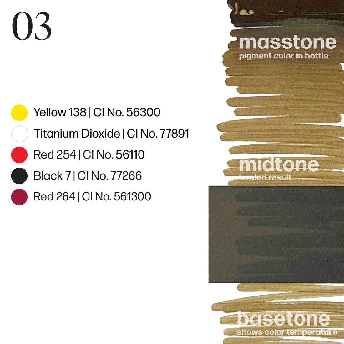 - 03: Neutrali, vidutiniškai ruda spalva idealiai tinka tamsiai šviesiems arba šviesiai rudiems plaukams.