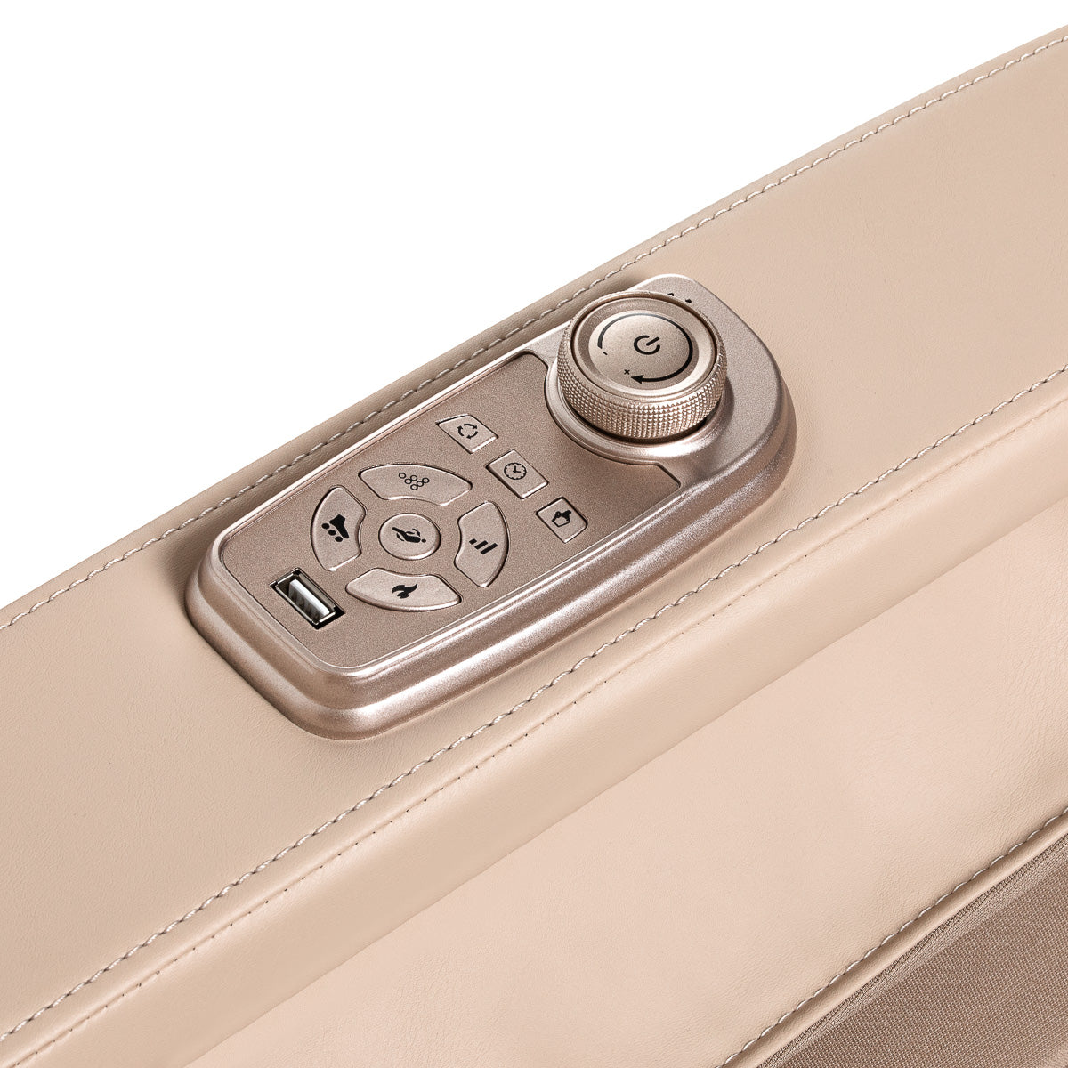Didesniam komfortui kėdė yra aprūpinta valdymo mygtukų rinkiniu, įmontuotu į kairįjį porankį. Patogus valdymas leidžia greitai pasiekti svarbiausias funkcijas, nereikalaujant siekti pagrindinio skydelio. Juo galima lengvai keisti masažo režimą, pradėti pėdų masažą arba aktyvuoti Zero Gravity funkciją – visa tai maksimalaus komforto ir palaimingos atsipalaidavimo labui. Taip pat yra USB lizdas, leidžiantis įkrauti telefoną masažo metu.