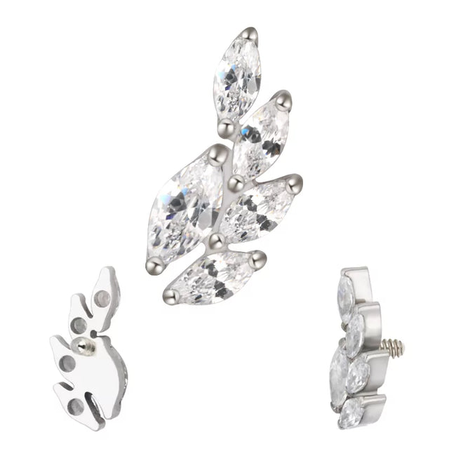 Implantacinio lygio titano auskarų aksesuaras su elegantišku kviečių žiedų įkvėptu markizės formos kristalų dizainu, sukurtas tikslumui, patogumui ir profesionaliam kūno auskarų vėrimui.