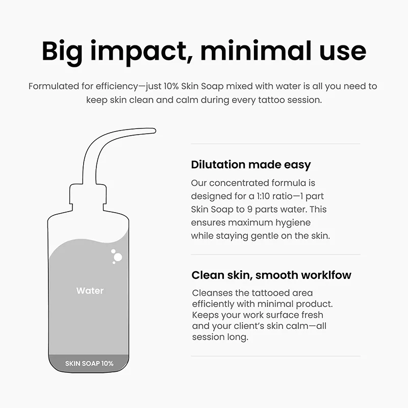 Yumain odos muilas yra profesionalios kokybės antibakterinis valiklis, sukurtas tatuiruočių meistrams, siekiant užtikrinti švarią, nuramintą odą kiekvienos sesijos metu. Šis švelnus muilas efektyviai pašalina perteklinį rašalą, nešvarumus, kraują ir priemaišas nesudirgindamas odos – todėl jis yra pagrindinis pasirinkimas odos paruošimui ir higienos palaikymui tatuiruojant ir darant auskarus.