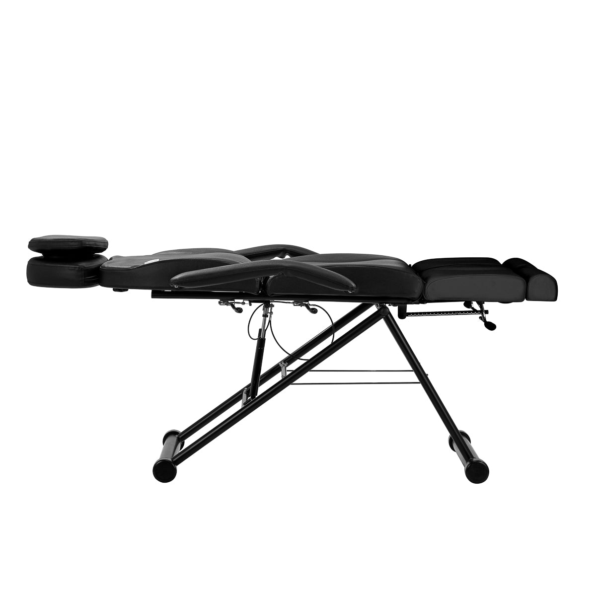 Kėdės pagrindas turi fiksuotą aukštį, todėl sėdynė yra pastovioje padėtyje, kas turėtų užtikrinti komfortą naudojant. Tvirtas metalinis rėmas juodos spalvos atspalviais užtikrina reikalingą stabilumą naudojimo metu. Galvos atrama, kuri išsiplečia apie 15 cm, suteikia puikią galvos atramą, nepriklausomai nuo kliento ūgio. Tai leidžia laisvai atlikti įvairias procedūras, įskaitant kosmetologiją, kineziterapiją ir tatuiravimą.