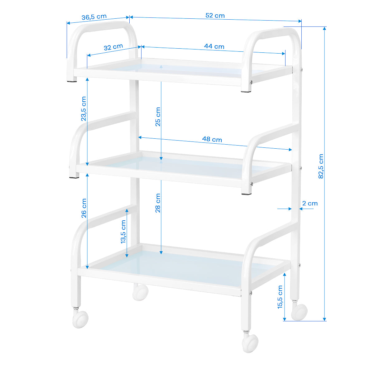 Kosmetikos staliukas Basic 122 yra funkcionalus baldų gaminys, kuris puikiai tiks bet kuriame grožio salone ar SPA. Lengva konstrukcija palengvina kasdienį darbą, o trys stiklinės lentynėlės suteikia patogią vietą kosmetikai, priedams ir įrangai laikyti. Minimalistinis dizainas suteikia profesionalumo atspalvį interjerui.