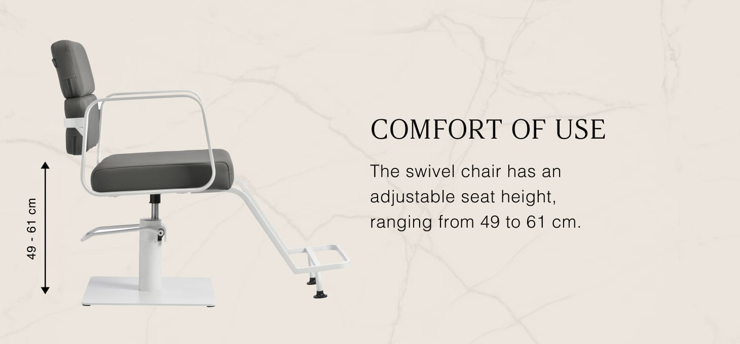 The durable hydraulic lift allows you to adjust the seat level within the range of 49-61 cm - even when the client is sitting on the chair. It ensures more ergonomic work, allowing you to adjust the seat level to the height of both the client and the hairdresser. The visually interesting backrest allows you to take a convenient position, providing excellent back support, which is especially important in the case of long-hour treatments. A big advantage of this model is the hole left between the backrest and the seat. It makes it easier to keep the salon clean by allowing you to easily sweep hair from every nook and cranny of the chair. This allows you to streamline the preparation of the workstation between clients.