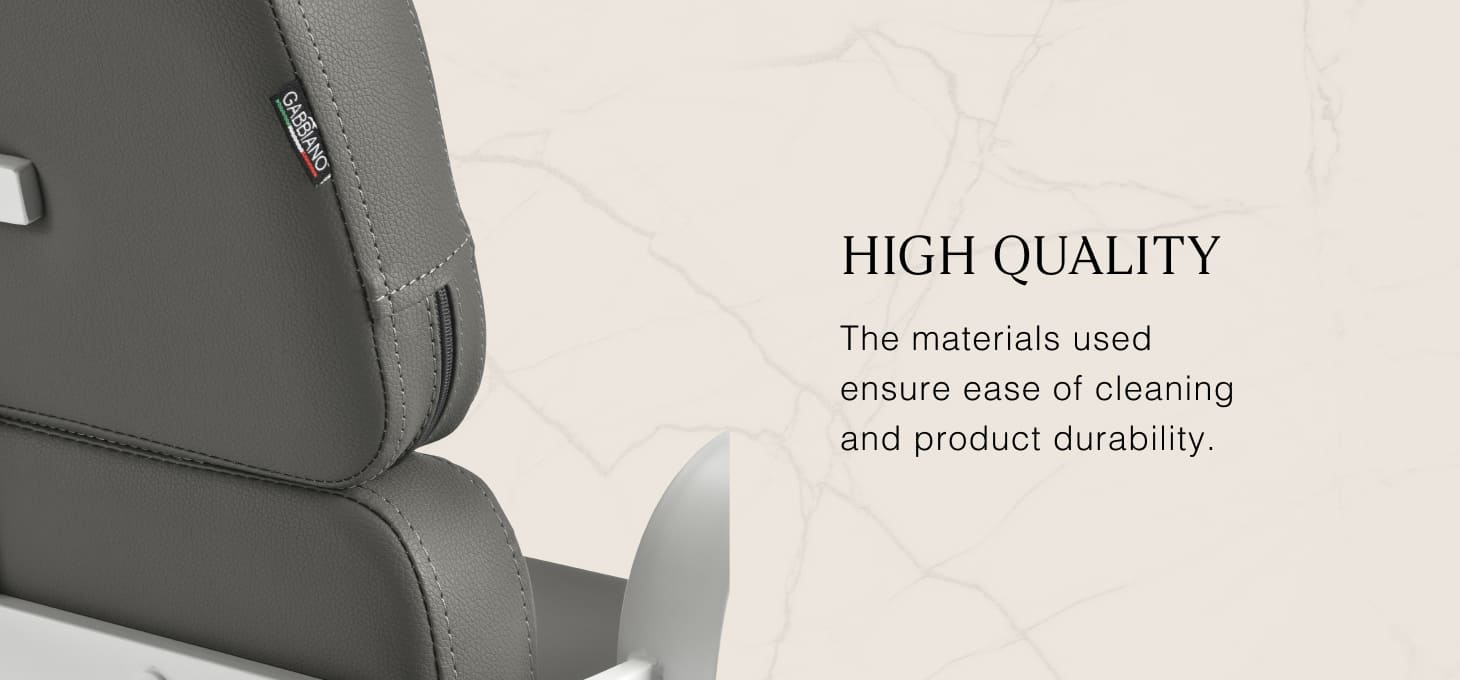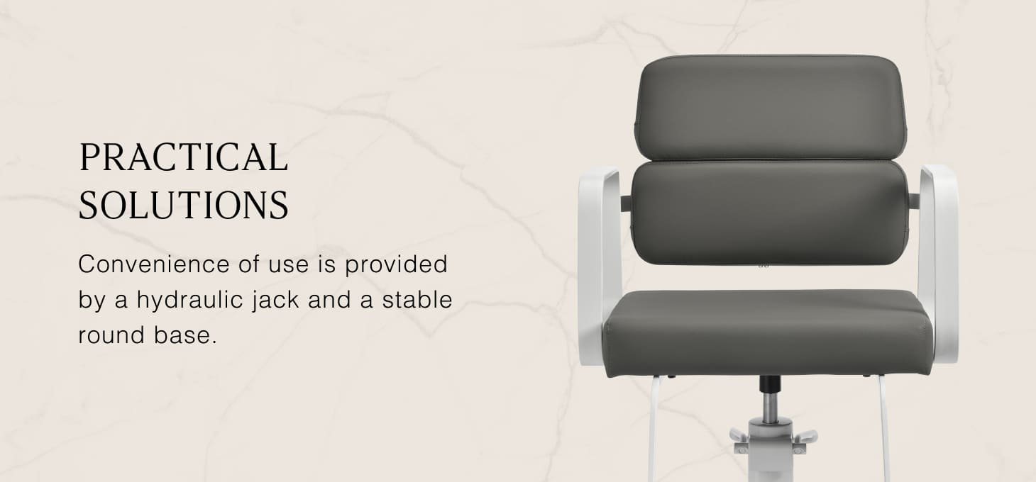 Filling with durable, deformation-resistant foam and upholstery made of pleasant-to-touch synthetic leather ensure the durability of the furniture and its comfortable use for a long time. It also makes the equipment resistant to moisture, durable and easy to clean. The gray covering gives it a unique character. The equipment is distinguished by a modern design, which makes the chair look great in many professional salons.
