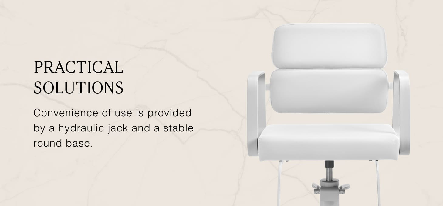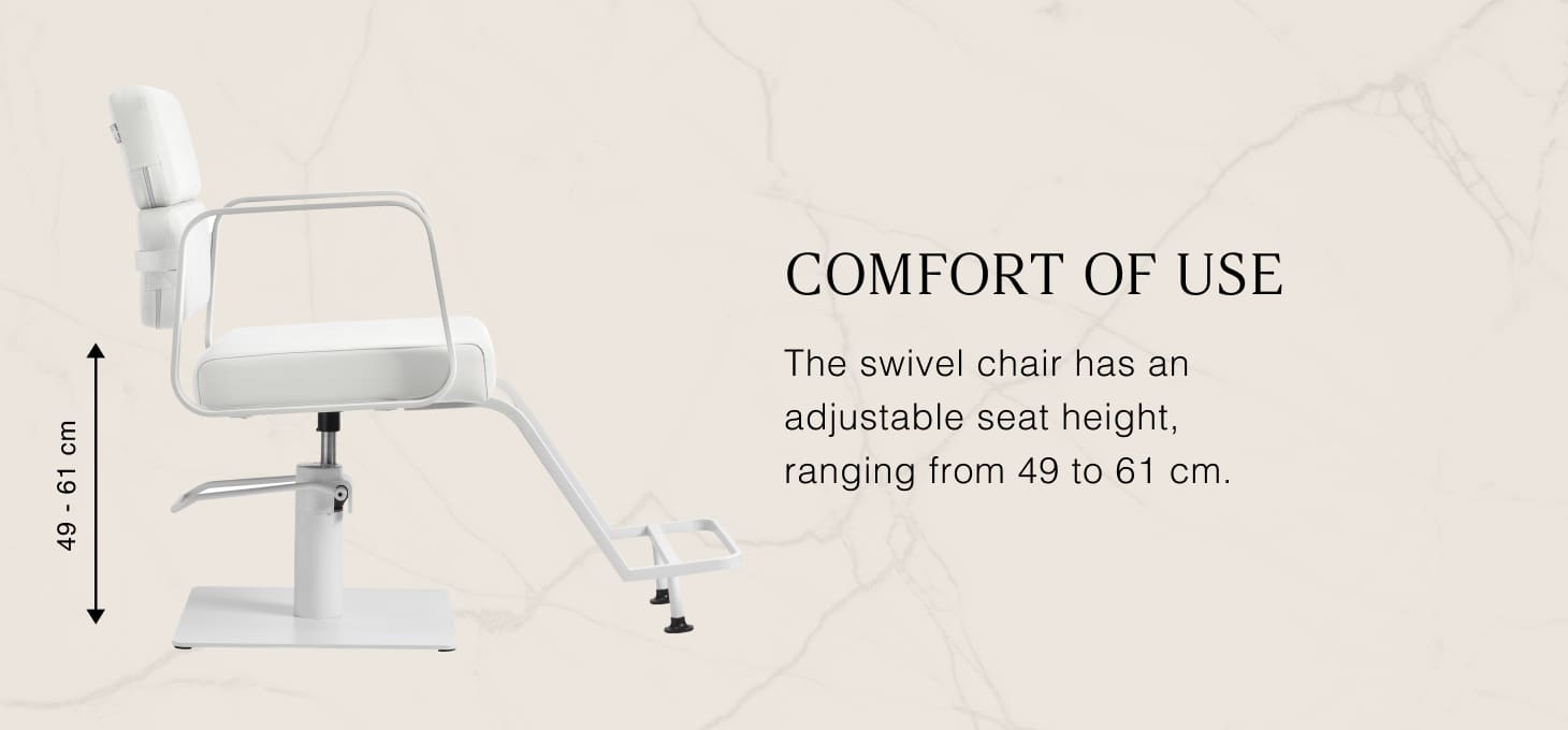 The durable hydraulic lift allows you to adjust the seat level within the range of 49-61 cm - even when the client is sitting on the chair. It ensures more ergonomic work, allowing you to adjust the seat level to the height of both the client and the hairdresser. The visually interesting backrest allows you to take a convenient position, providing excellent back support, which is especially important in the case of long-hour treatments. A big advantage of this model is the hole left between the backrest and the seat. It makes it easier to keep the salon clean by allowing you to easily sweep hair from every nook and cranny of the chair. This allows you to streamline the preparation of the workstation between clients.