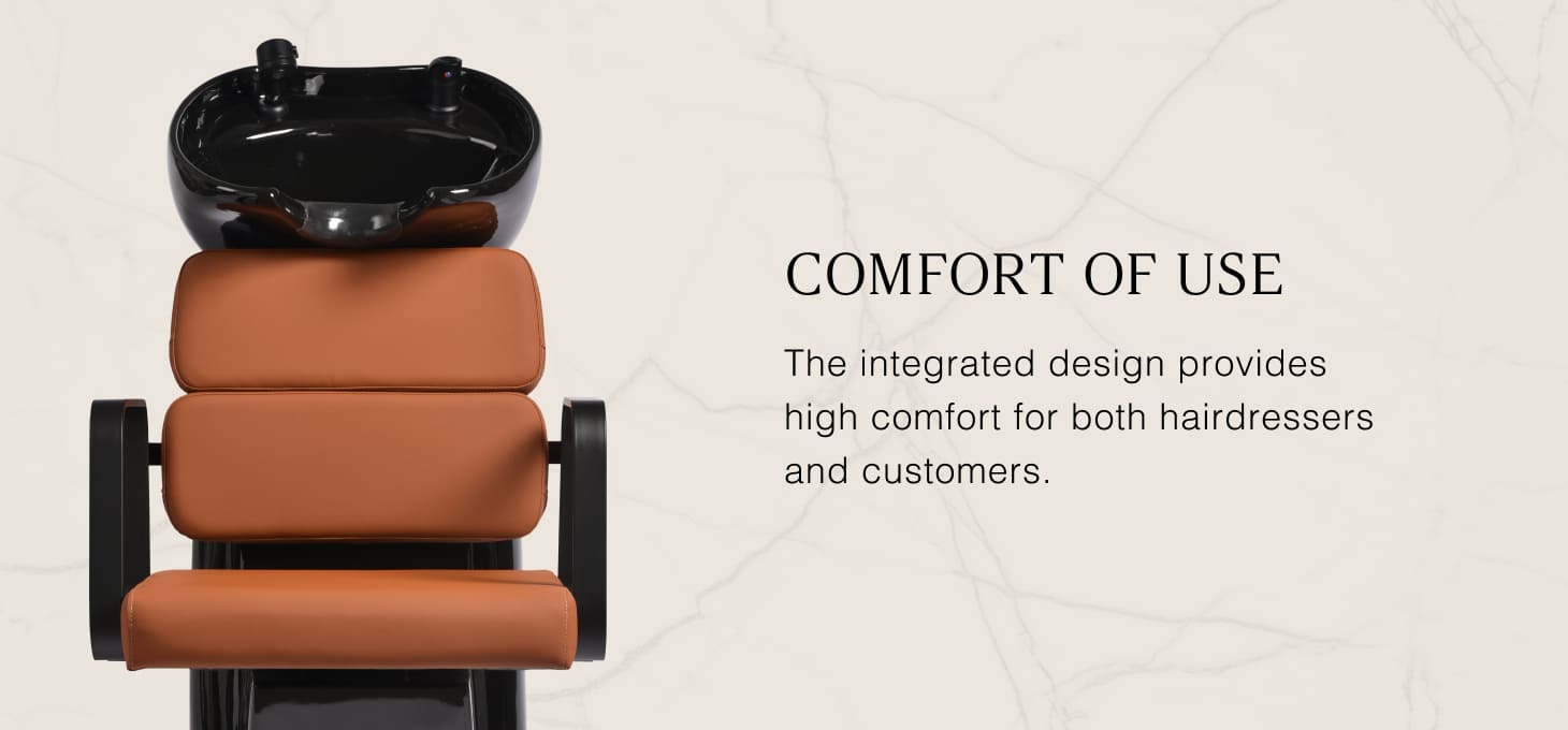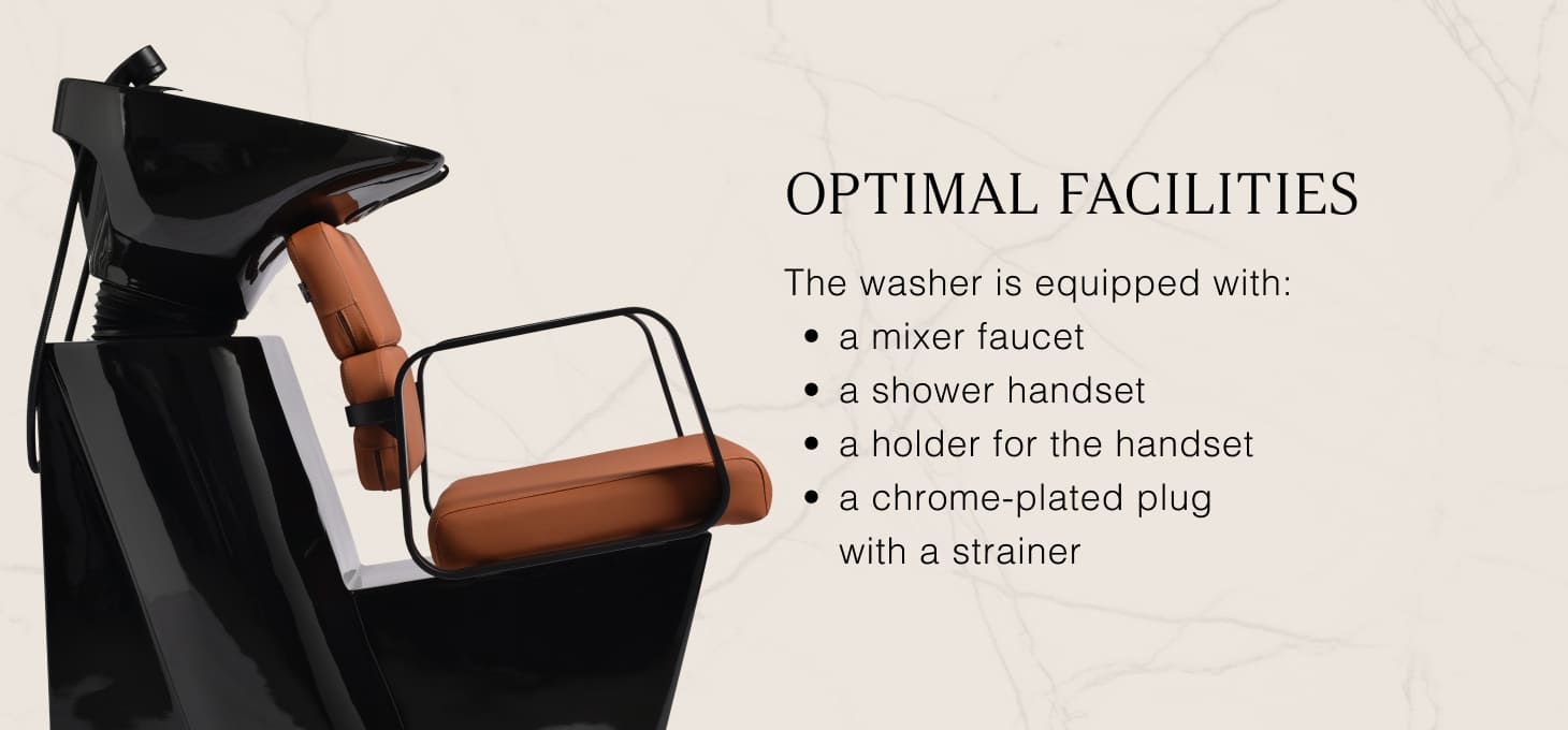 The profiled chair provides adequate lumbar support and, therefore, high comfort of use. Metal armrests in shades of black with a geometric shape allow for the correct positioning of the customer's shoulders. Filling with durable, deformation-resistant foam and upholstery made of pleasant-to-touch synthetic leather in shades of orange ensure the durability of the furniture, ease of cleaning and comfortable use for a long time. The original, elegant appearance of the hair wash unit gives the interior a unique expression. The set includes complete fittings in shades of black, including a faucet, a shower head and dedicated hoses to provide a complete set of tools for work.