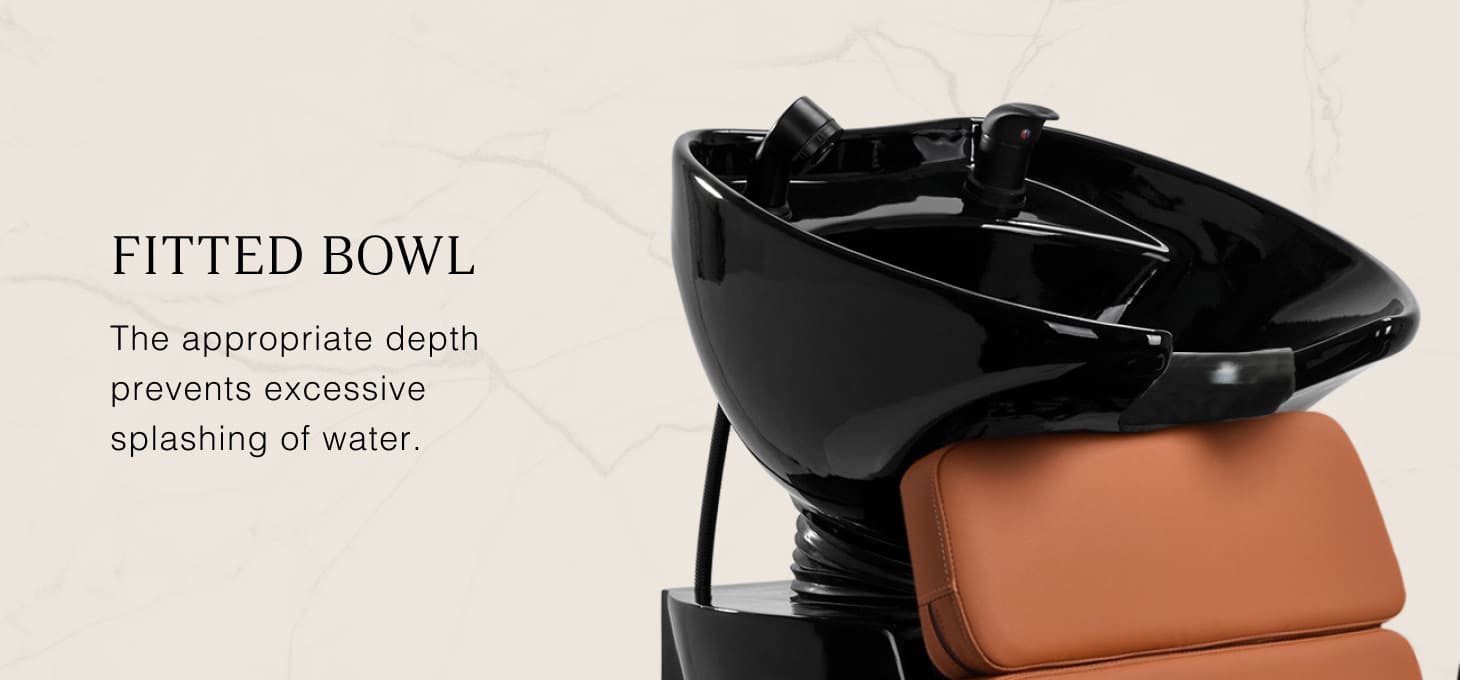 The appropriate depth of the white ceramic washbasin bowl prevents excessive splashing of water or products used during treatments. This allows for comfortable and effective performance of a wide range of services. The angle of the bowl can be adjusted, making it easy to adapt to individual needs. The high quality of the materials used makes the washbasin durable, resistant to discoloration and scratches, and very easy to clean. A properly profiled collar and inclined backrest provide support and comfort when washing the hair, and thanks to the comfortable black plastic overlay, the customer will not feel the unpleasantness of the cold ceramic surface.