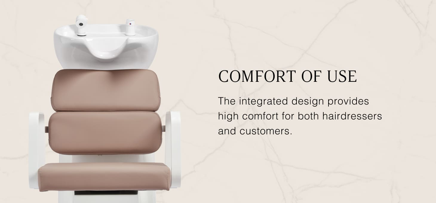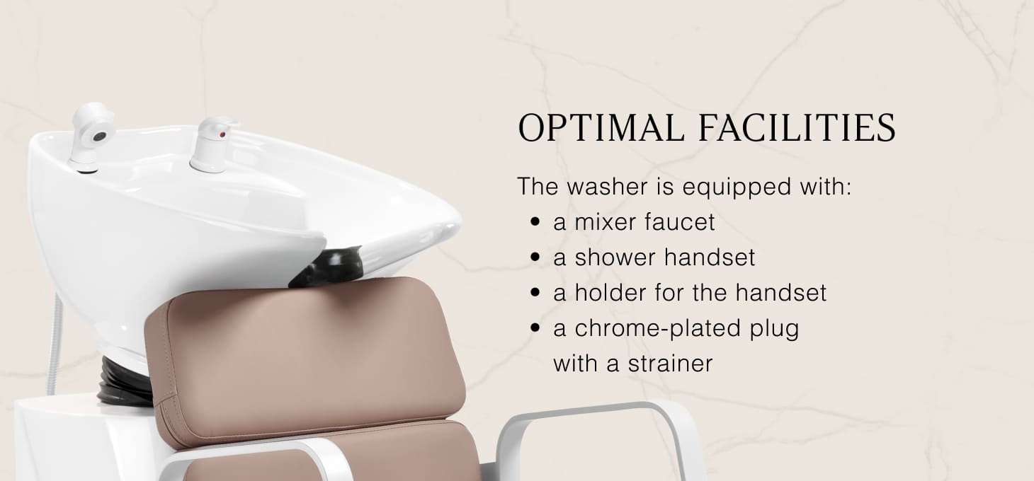 The practical hair wash unit is equipped with a mixer faucet, which provides easy access to hot and cold water. This makes it easier to adjust the temperature to the customer's individual preferences. A dedicated place to hang up the handset makes work easier, and the chrome-plated plug with a special strainer allows you to control the water flow and maintain high hygiene standards in the salon. The water connection has been placed inside the base, allowing the pipes to be easily hidden. A significant advantage of this model is the opening left between the backrest and the seat, which makes it easier to keep the living room clean by allowing you to easily sweep dirt from every nook and cranny of the chair. The hair wash unit has been designed in such a way as to ensure comfort during various treatments, ensuring proper back support. The combination of functionality and amenities makes working in a hairdressing salon even more comfortable.