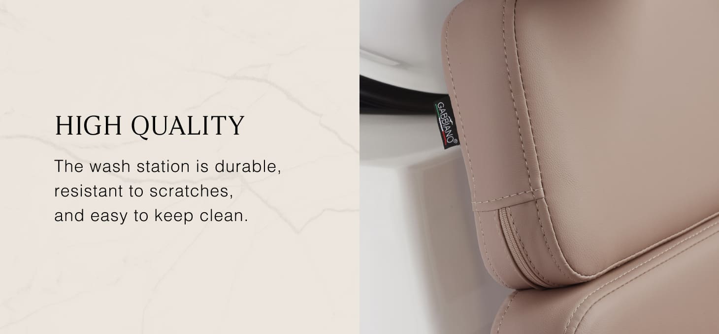 The profiled chair provides adequate lumbar support and, therefore, high comfort of use. Metal armrests in shades of white with a geometric shape allow for the correct positioning of the customer's shoulders. Filling with durable, deformation-resistant foam and upholstery made of pleasant-to-touch synthetic leather in shades of beige ensure the durability of the furniture, ease of cleaning and comfortable use for a long time. The original, elegant appearance of the hair wash unit gives the interior a unique expression. The set includes complete fittings in shades of white, including a faucet, a shower head and dedicated hoses to provide a complete set of tools for work.