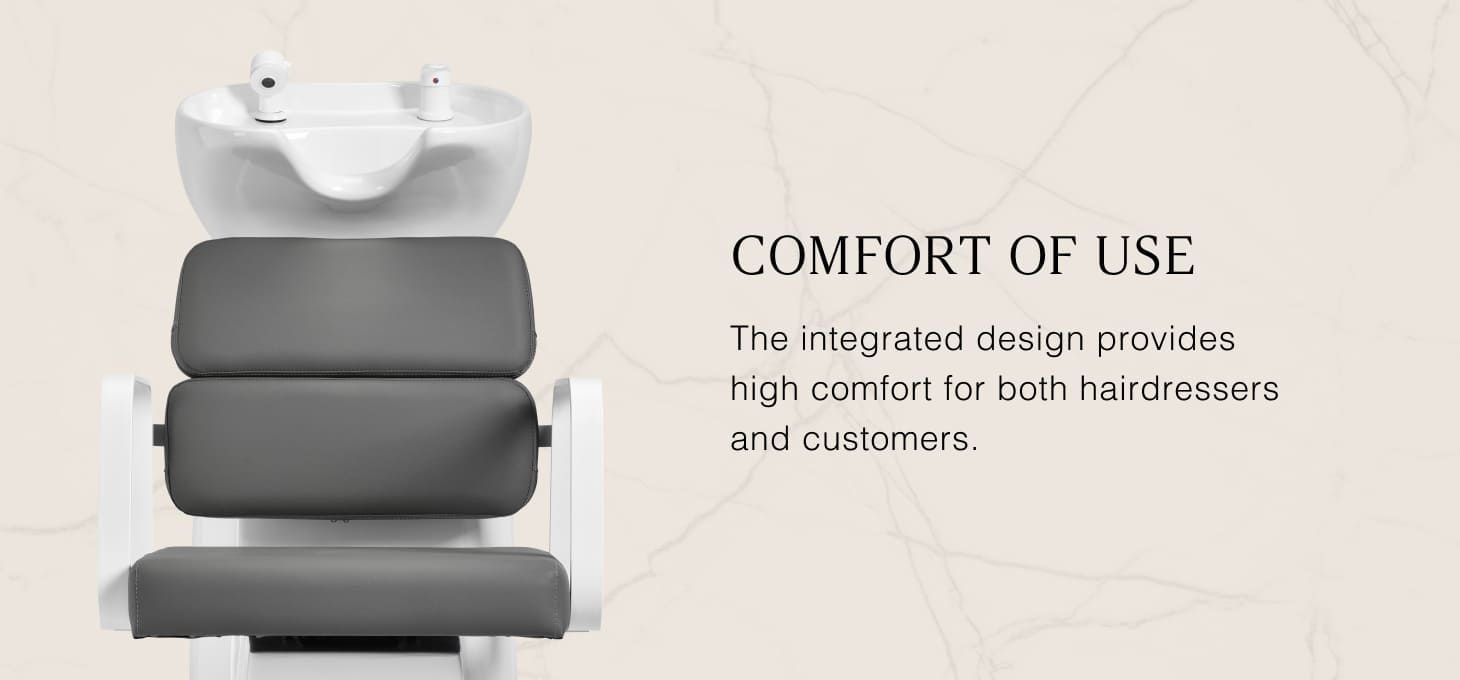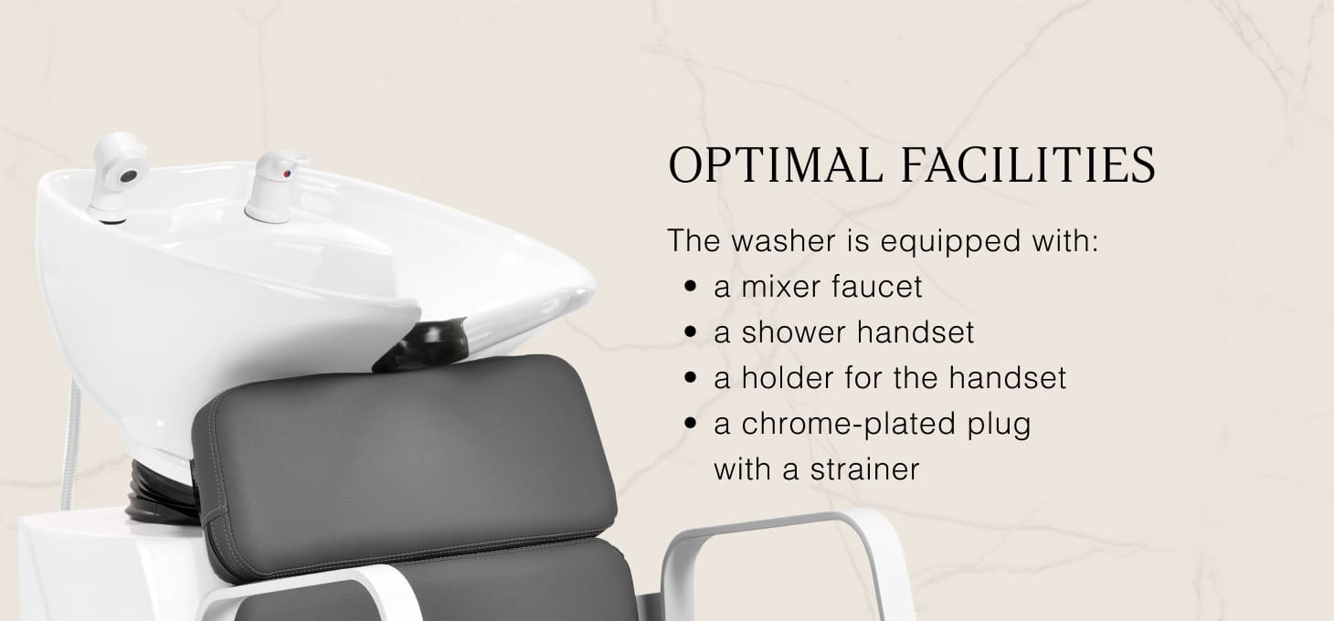 The practical hair wash unit is equipped with a mixer faucet, which provides easy access to hot and cold water. This makes it easier to adjust the temperature to the customer's individual preferences. A dedicated place to hang up the handset makes work easier, and the chrome-plated plug with a special strainer allows you to control the water flow and maintain high hygiene standards in the salon. The water connection has been placed inside the base, allowing the pipes to be easily hidden. A significant advantage of this model is the opening left between the backrest and the seat, which makes it easier to keep the living room clean by allowing you to easily sweep dirt from every nook and cranny of the chair. The hair wash unit has been designed in such a way as to ensure comfort during various treatments, ensuring proper back support. The combination of functionality and amenities makes working in a hairdressing salon even more comfortable.