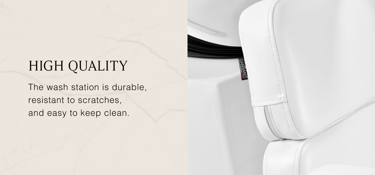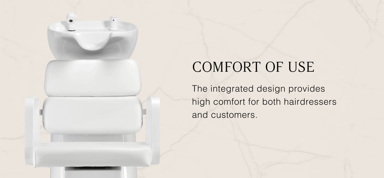 The appropriate depth of the white ceramic washbasin bowl prevents excessive splashing of water or products used during treatments. This allows for comfortable and effective performance of a wide range of services. The angle of the bowl can be adjusted, making it easy to adapt to individual needs. The high quality of the materials used makes the washbasin durable, resistant to discoloration and scratches, and very easy to clean. A properly profiled collar and inclined backrest provide support and comfort when washing the hair, and thanks to the comfortable black plastic overlay, the customer will not feel the unpleasantness of the cold ceramic surface.