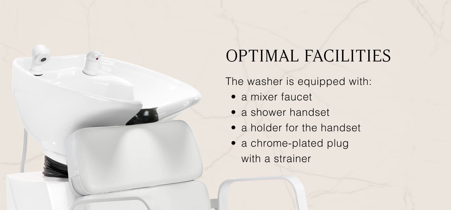 The profiled chair provides adequate lumbar support and, therefore, high comfort of use. Metal armrests in shades of white with a geometric shape allow for the correct positioning of the customer's shoulders. Filling with durable, deformation-resistant foam and upholstery made of pleasant-to-touch synthetic leather in shades of white ensure the durability of the furniture, ease of cleaning and comfortable use for a long time. The original, elegant appearance of the hair wash unit gives the interior a unique expression. The set includes complete fittings in shades of white, including a faucet, a shower head and dedicated hoses to provide a complete set of tools for work.