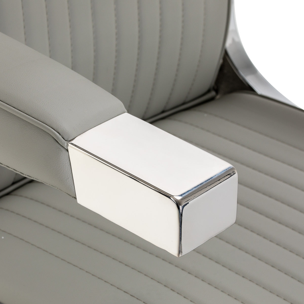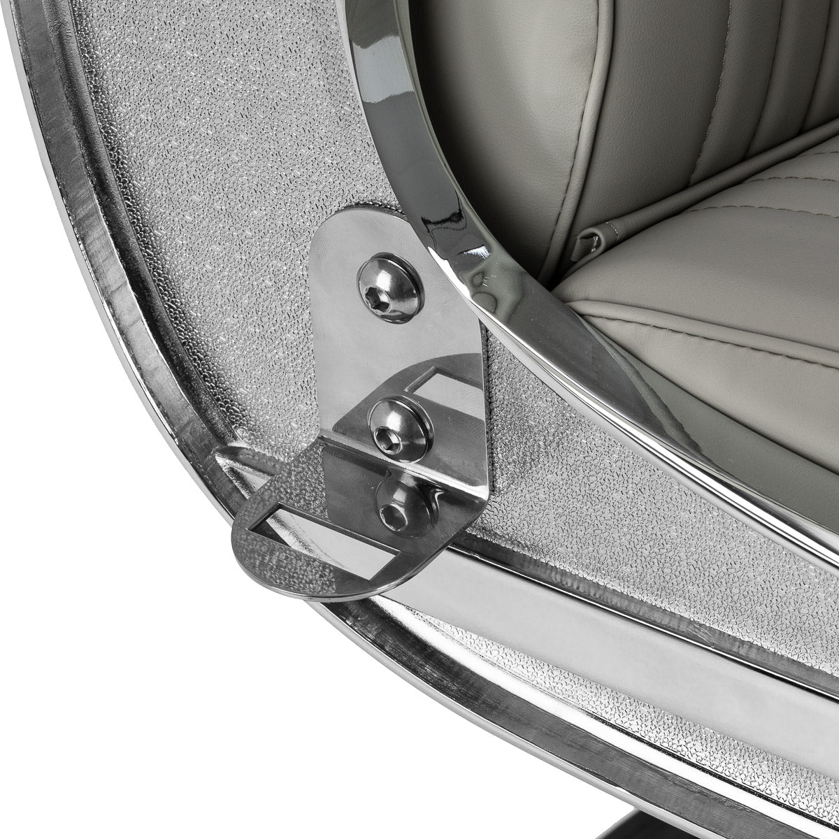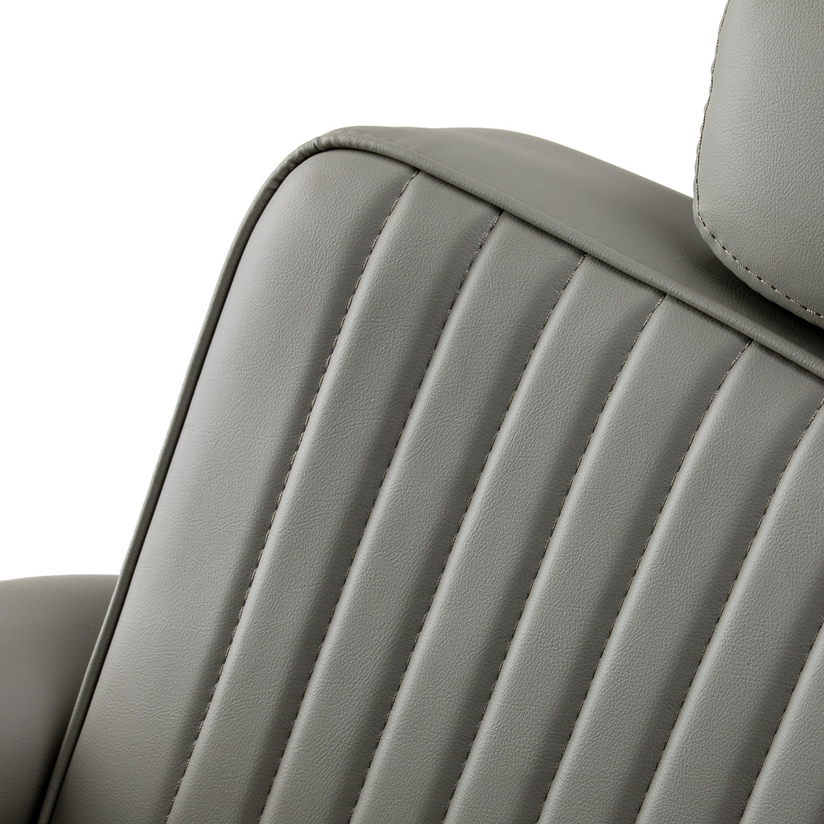 Tvirta pagrindo konstrukcija užtikrina stabilumą ir aukštą komfortą. Sėdynė užpildyta deformacijai atspariomis putomis ir apmušta minkšta, matinės faktūros sintetiniu oda, jungiančia patvarumą su komfortu. Apdailai naudojamos medžiagos yra atsparios drėgmei, patvarios ir lengvai valomos, todėl kėdė puikiai tinka kasdieniam naudojimui. Stilingos siūlės ir apmušalai pilkų atspalvių suteikia jai unikalų charakterį, puikiai derantį prie modernių kirpyklų interjero.