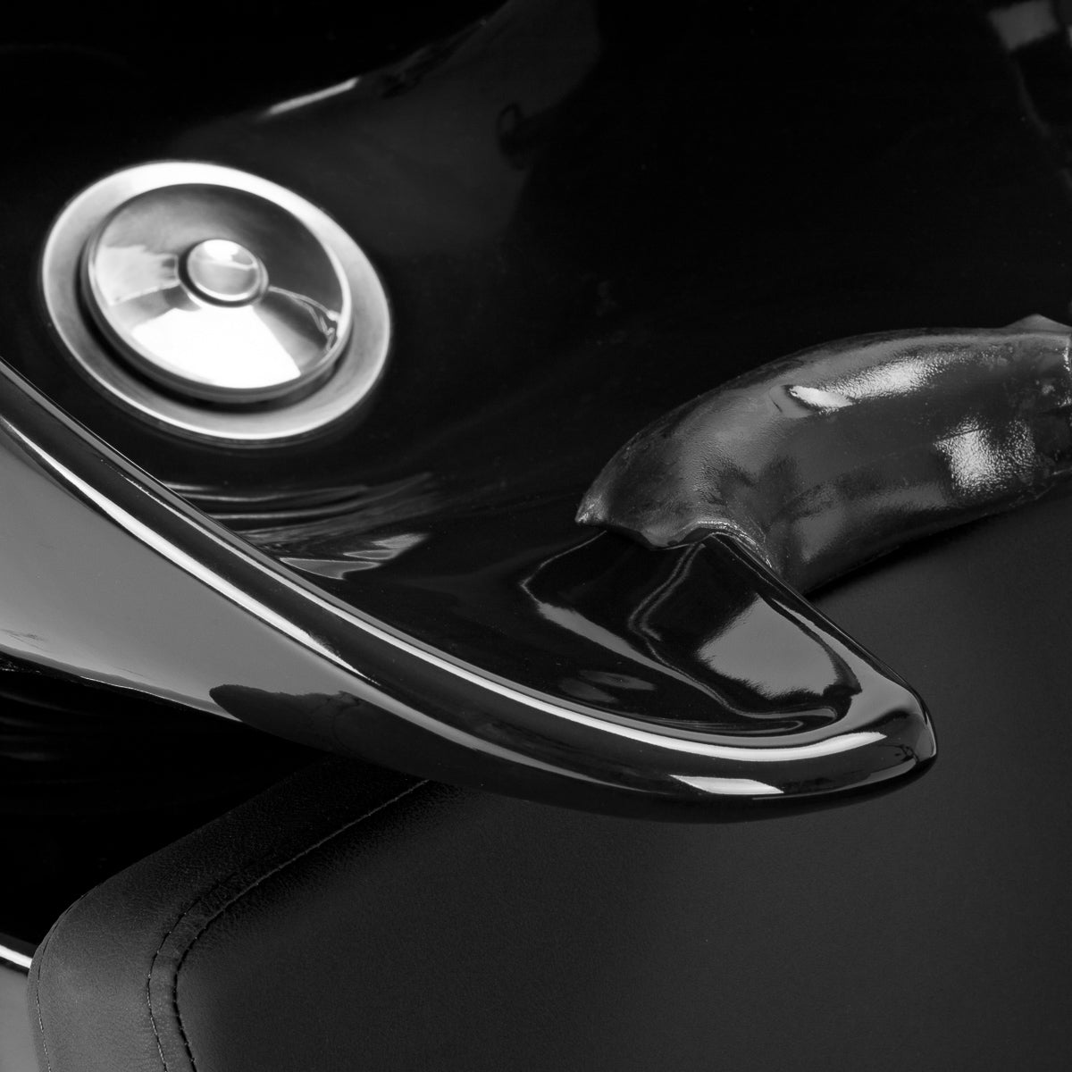 Geometriškai suformuota kėdė sujungia modernią paprastumą su naudojimo patogumu. Sėdynė ir porankiai su švelniais kampais kuria harmoningą visumą, užtikrinančią patogią padėtį procedūrų metu, o atlošas su optimaliu pasvirimo kampu palaiko taisyklingą laikyseną ir atsipalaidavimą. Aukštos kokybės sintetinis odos apmušalas juodų atspalvių yra atsparus dėvėjimuisi ir drėgmei, taip pat lengvai valomas. Paprasta, moderni baldų forma pabrėžia plovimo įrenginio elegantiškumą, o pilna įranga – maišytuvas, dušo galvutė ir specialūs žarneliai – suteikia visą reikalingą darbo įrankių rinkinį.