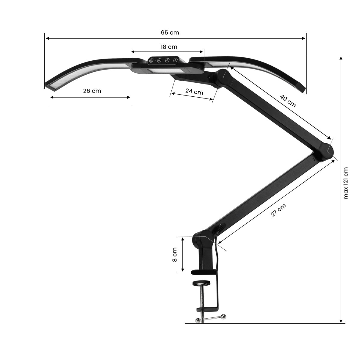Plona, geometrinė lempos forma traukia dėmesį savo moderniu, bet tuo pačiu ir laiko nepavaldžiu dizainu. Balta spalvų gama kartu su matinio paviršiaus apdaila suteikia dizainui elegantišką, profesionalų charakterį, kuris puikiai dera minimalistiniuose grožio salonų interjeruose. Tvirtinimas prie stalo galimas dėka spaustuko tipo laikiklio su maksimaliu atidarymu 6,3 cm, tinkamo daugumai stalų. Visa tai sukuria deringą, estetišką įrangos vienetą, derinantį aukštą funkcionalumą su rafinuotu dizainu.