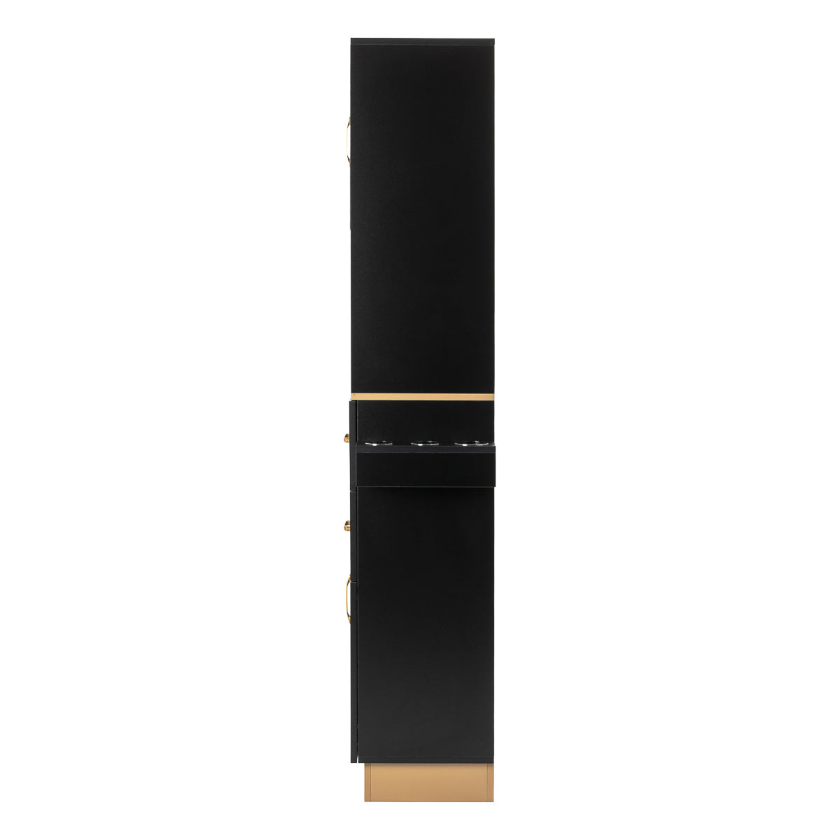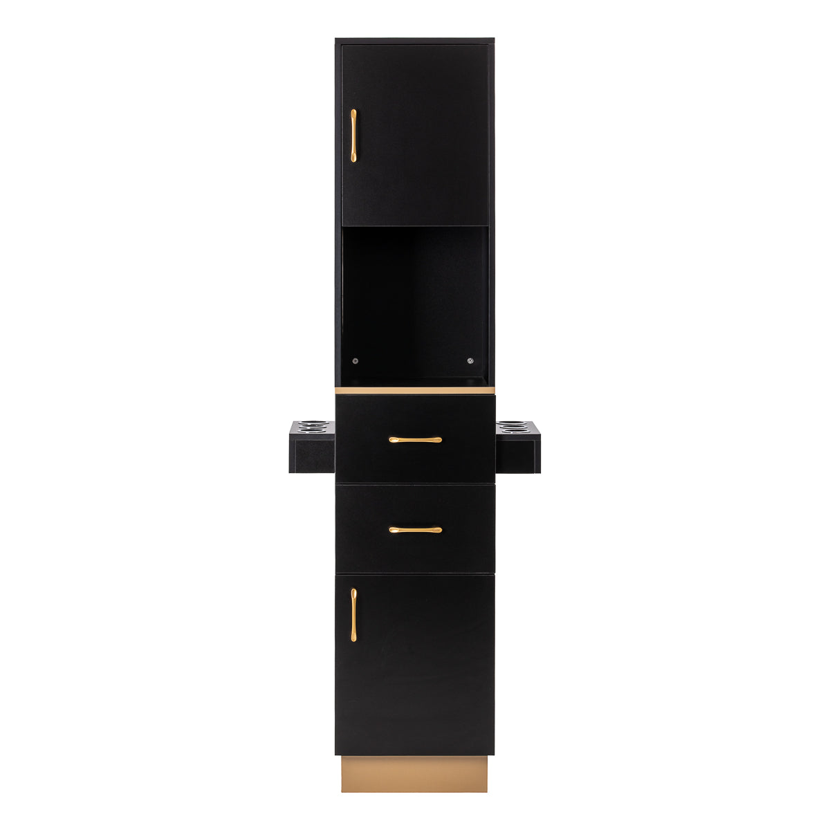Tvirta konstrukcija užtikrina stabilumą, o lygios paviršiaus dalys palengvina vieneto valymą. Klasikinė spalvų schema suteikia spintai laiko nepavaldų charakterį, kuris puikiai tiks tiek minimalistiniuose, tiek išskirtiniuose interjeruose. Aukso spalvos rankenėlės ne tik pabrėžia elegantišką dizainą, bet ir užtikrina sklandų kiekvienos spintelės ir stalčiaus atidarymą. Visa įranga yra praktiškas sprendimas kirpyklai, kur tvarka, ergonomiškos darbo sąlygos ir nuosekli estetika yra būtinos.