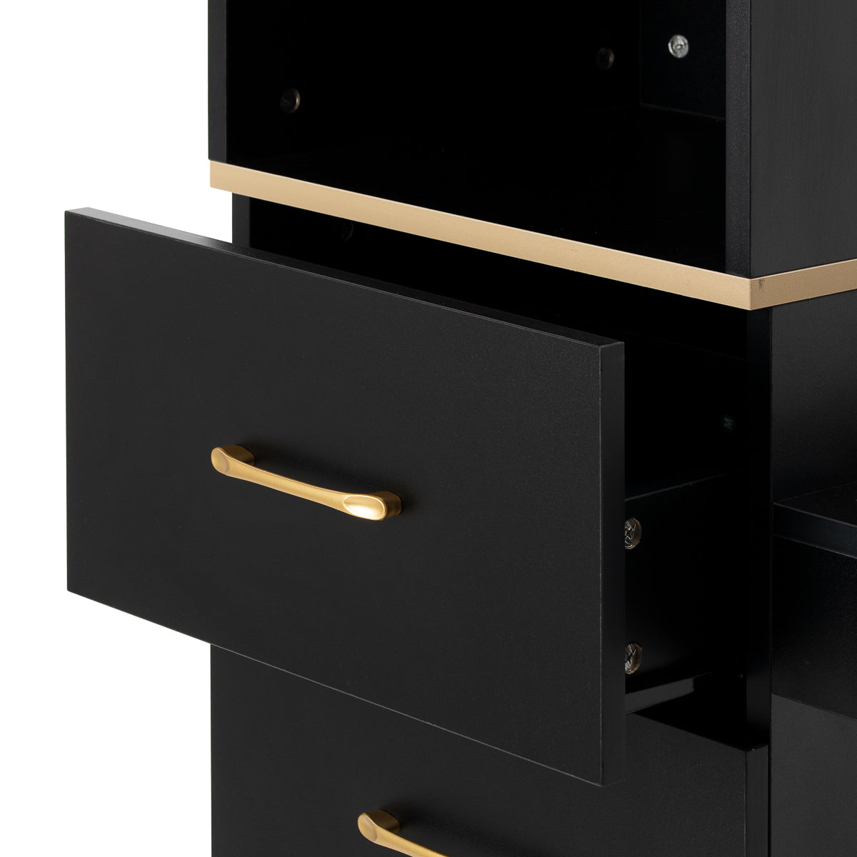 Stoties dizainas buvo sukurtas ir užtikrintų patogų prieigą prie būtinų aksesuarų. Užrakinamos spintelės ir stalčiai padeda išlaikyti tvarkingą išvaizdą, o atvira centrinė erdvė suteikia greitą prieigą prie dažniausiai naudojamų aksesuarų. Šoniniai lentynėliai padidina darbo paviršių, leidžiant patogiai laikyti įrankius, naudojamus stilizavimui.