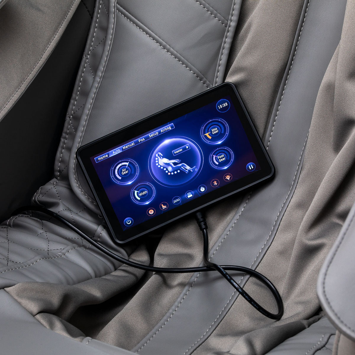 Valdymo skydelis leidžia lengvai pritaikyti masažą pagal jūsų individualius poreikius. Didesniam patogumui jį galima padėti laikiklyje dešiniajame porankyje arba laikyti rankose. Ekrane aiškiai matoma visa svarbiausia informacija – šiuo metu masažuojamos kūno dalys, masažo intensyvumas, sesijos trukmė ir pasirinkta programa. Skydelis leidžia perjungti automatinį ir rankinį režimus bei įjungti balso valdymą, didinant naudojimo komfortą. Juo patogu pasirinkti iš galimų masažo režimų, reguliuoti intensyvumą, keisti kėdės nustatymus ir tiksliai nustatyti sesijos trukmę 5 minučių intervalais (5, 10, 15, 20, 25 arba 30 minučių), užtikrinant idealų masažo laiką pagal naudotojo poreikius.