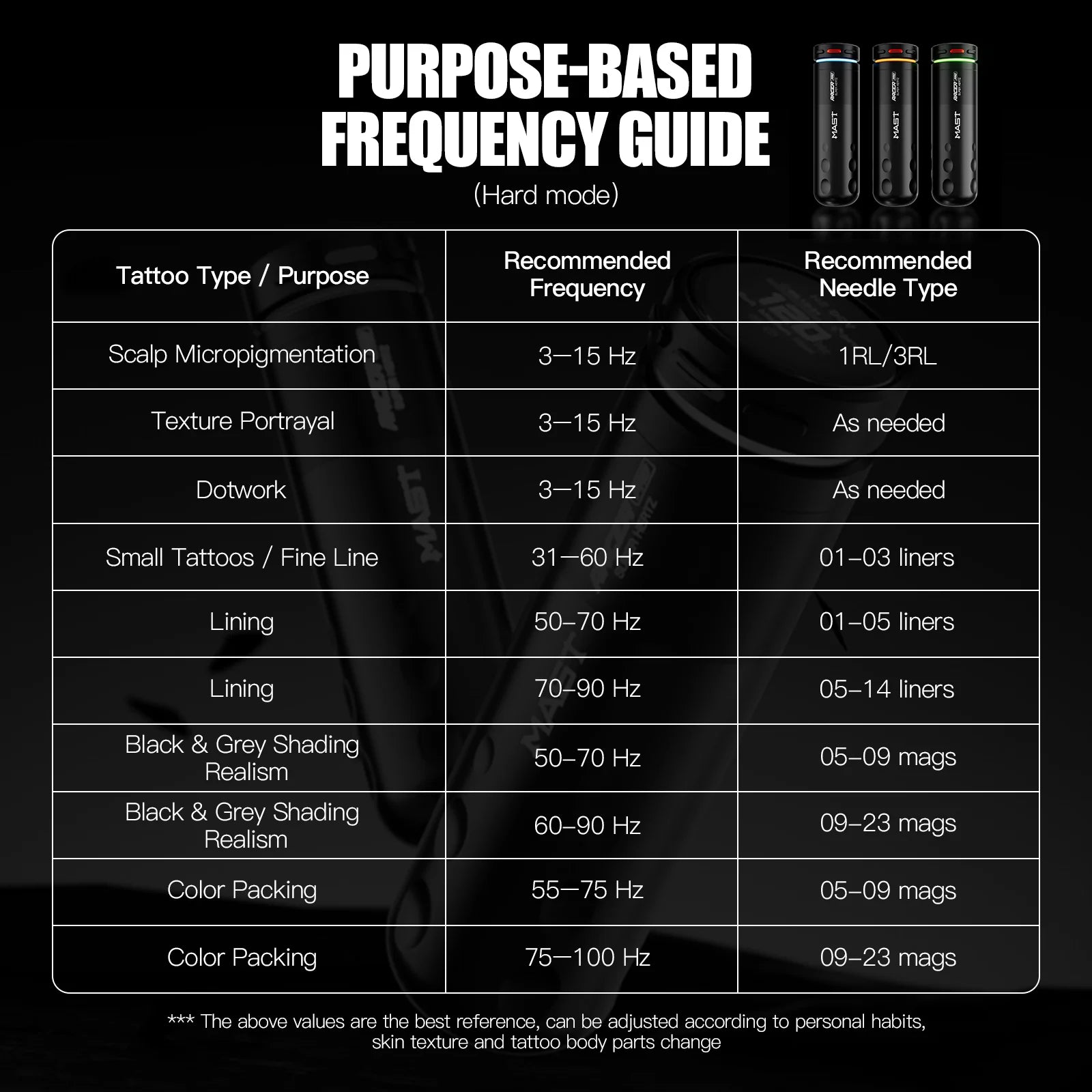 Hz režimas (3–140 Hz) sinchronizuoja adatos judesį su rankos judesiu, užtikrindamas jautrų ir pastovų valdymą – su minkštu, vidutiniu, kietu ir taško nustatymais, pritaikytais individualiam veikimui.