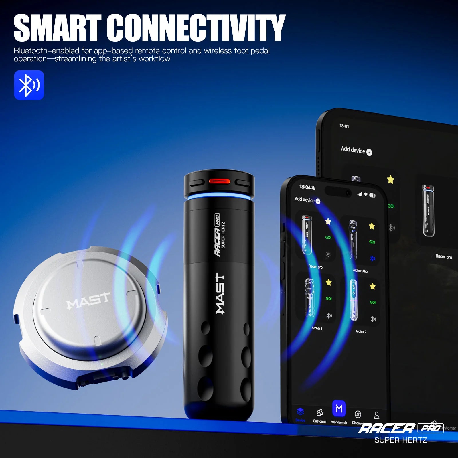 Įrengtas su „Bluetooth“ ryšiu, belaidžio kojinio pedalo palaikymu ir aiškiu 0,85 colio HD spalvotu ekranu, Mast Racer Pro suteikia visišką valdymą jūsų rankose – leidžiantį susitelkti į meną, o ne į įrangos nustatymus. Sukurtas ilgaamžiškumui, lengvas ir skirtas tikslumui, tai naujasis profesionalių belaidžių tatuiruočių mašinėlių standartas.