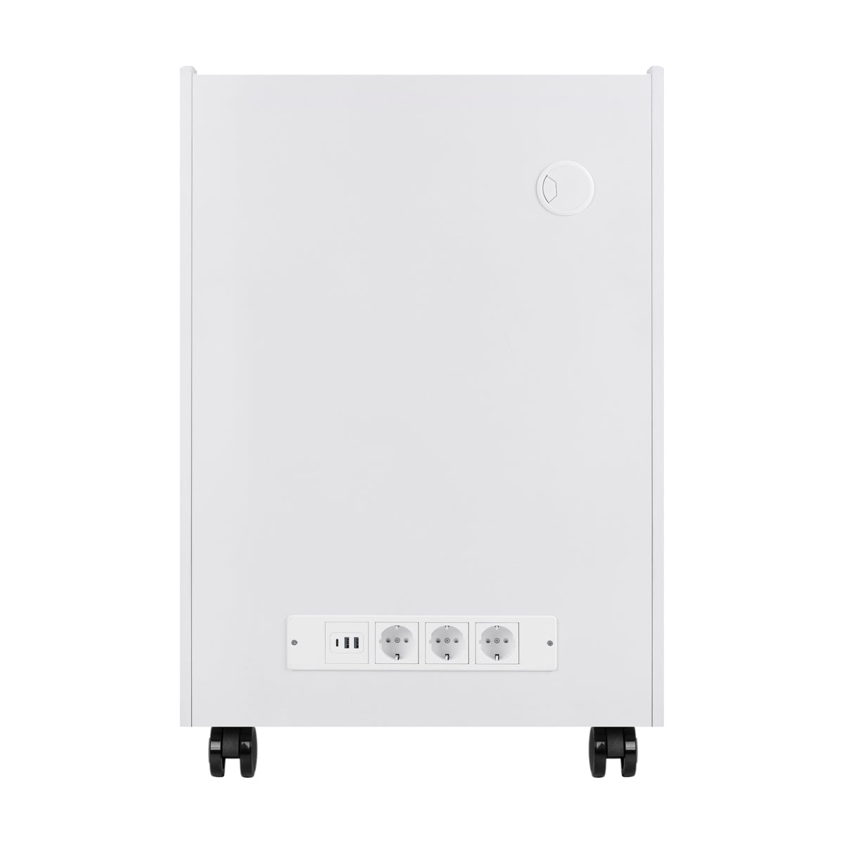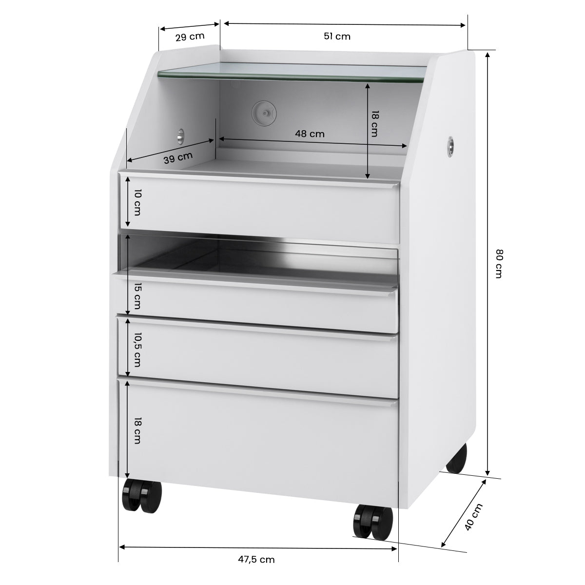Praktiškos ratukų kojelės palengvina sklandų spintelės judėjimą. Paprasta, santūri balta forma suteikia baldams universalią, profesionalią išvaizdą, kuri puikiai dera prie šiuolaikinių interjerų. Dizainas, sukurtas atsižvelgiant į pėdų priežiūros specialistų poreikius, suteikia specialią vietą pėdų priežiūros grąžtui ir būtiniausiems priedams, skatinant patogų ir ergonomišką darbą procedūrų metu.