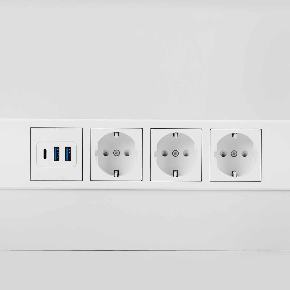 Pagalbininkas turi galinę plokštę su trimis elektros lizdais, dviem USB jungtimis ir viena USB-C jungtimi, leidžiančią patogiai prijungti įvairius įrenginius. Kabelių angos, esančios šonuose prie viršutinio stalčiaus, padeda palaikyti tvarką. Integruotas didinamojo žibinto laikiklis leidžia tvirtai pritvirtinti žibinto ranką arti gydymo vietos, neužimant vietos ant darbo paviršiaus, taip užtikrinant tikslų apšvietimą ir ergonomišką darbą.