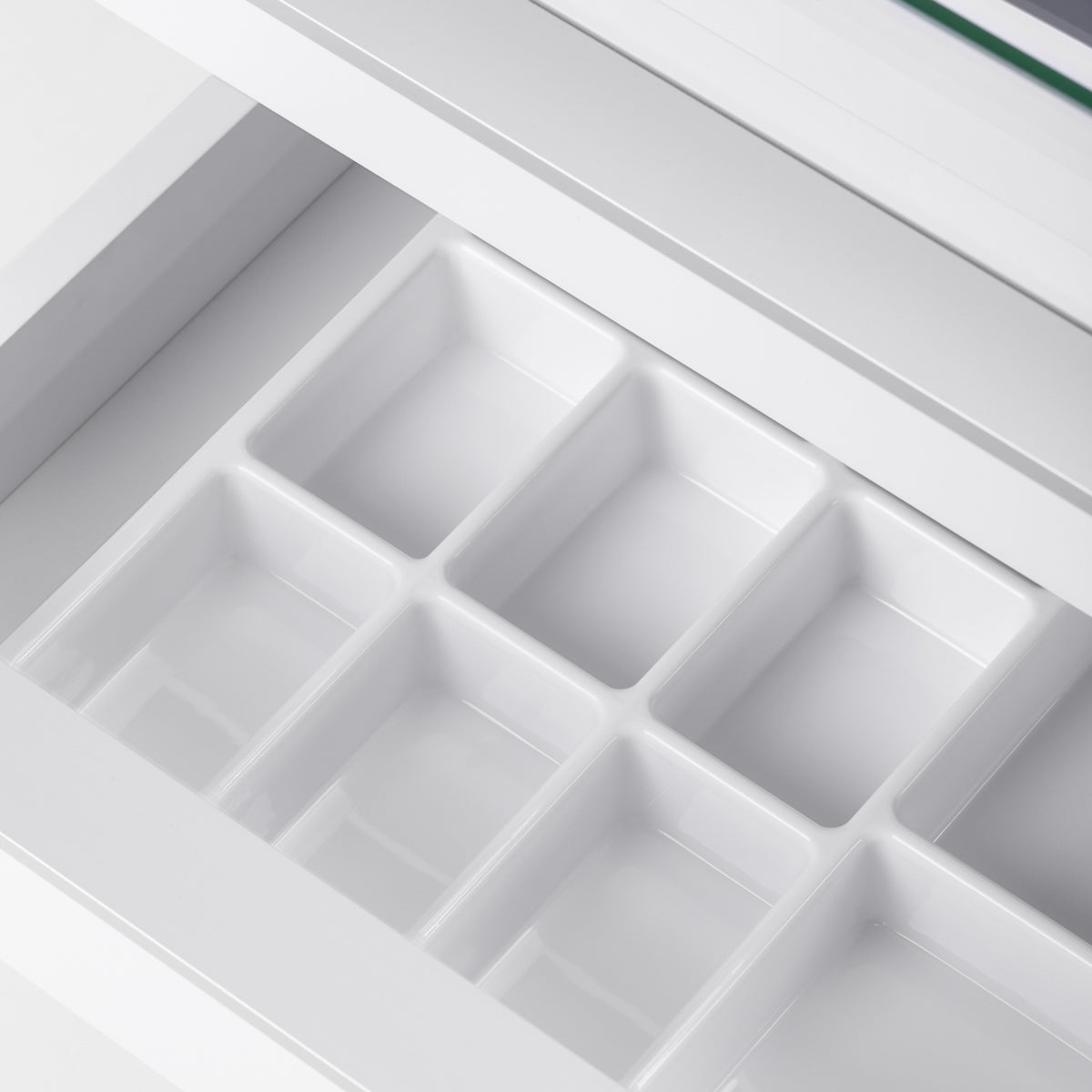 patogiai laikyti dažniausiai naudojamus priedus. Spintelė turi keturis stalčius įvairių dydžių, kurie palengvina įrankių ir kosmetikos produktų tvarkingą laikymą. Vieno stalčiaus veidrodinis dugnas ir specialus vidinis organizatorius padeda geriau susitvarkyti su įrankiais, užtikrinant greitą prieigą prie būtinų priedų ir didinant komfortą gydymo metu. Viršutinio atviro stalčiaus aukštis leidžia patalpinti svarbią įrangą, pavyzdžiui, nagų grąžtą su dulkių surinkėju.