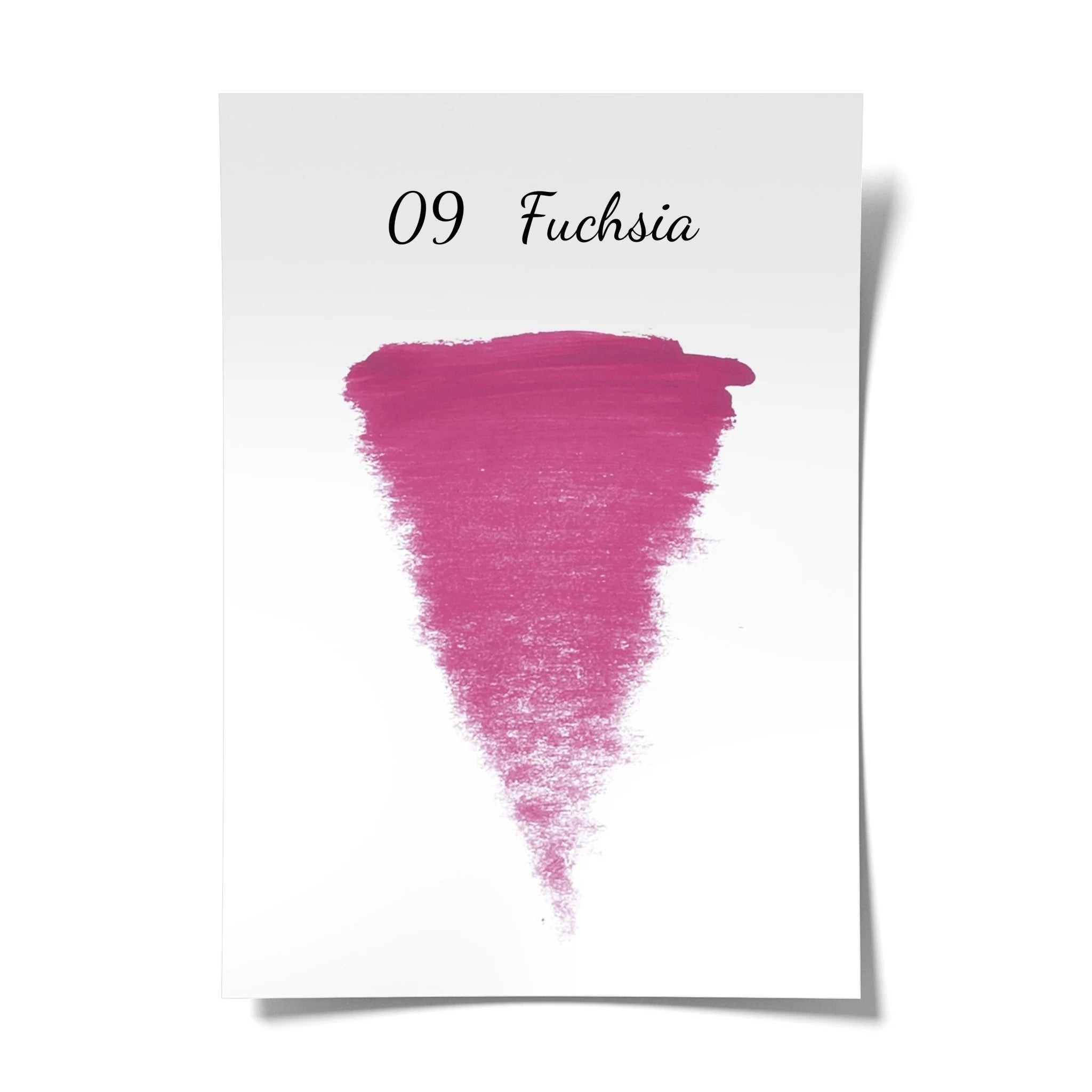 09 Fuchsia yra vėsios temperatūros hibridinis lūpų pigmentas su ryškiu rožiniu–fuksijos potoniu. Šis atspalvis atrodo energingas ir gaivus, suteikdamas lūpoms spindinčio ryškumo, tačiau išlaikantis natūralų vaizdą. Puikiai tinka klientėms, mėgstančioms modernius akcentus arba norinčioms subalansuoti šiltus ir neutralius lūpų potonius.